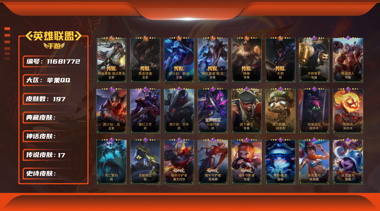 [11681772]可二次 可修改实名 17传说 83史诗 197皮肤 128英雄 钻石 皮肤:布隆-末路管家,布隆-龙冕御盾,布隆-圣诞老人,布隆-猎龙勇士,布隆-狮心,亚索-神龙尊者 昼日真龙,亚索-西部牛仔,亚索-源计划:风,亚索-黑夜使者,亚索-腥红之月,烬-龙冕异士,烬-源计划:升华,烬-灭迹行者,烬-腥红之月,艾希-王牌司令,艾希-源计划:联合,艾希-极地女神,艾希-黑暗骑士,李青-神龙尊者 圣龙,李青-至高之拳,李青-神拳,李青-地下拳王,阿木木-殇之机器人,阿木木-小小骑士,阿木木-惊悚派对,阿木木-地狱火,劫-死亡誓约,劫-灵能特工,劫-冲击之刃,劫-天煞,嘉文四世-孤胆英豪,嘉文四世-王牌上将,嘉文四世-福牛守护者,璐璐-寒冬精灵,璐璐-泳池派对,璐璐-邪恶女巫,璐璐-光耀之灵,菲奥娜-泳池派对,菲奥娜-皇家守卫,菲奥娜-绯金丽刃,菲奥娜-福牛守护者,安妮-银河魔装机神,安妮-小红帽,安妮-冰霜烈焰,安妮-福牛守护者,菲兹-兔宝宝,菲兹-欧米伽小队 鬼影蛙人,菲兹-绒毛,菲兹-虚空海灵,提莫-小蜜蜂