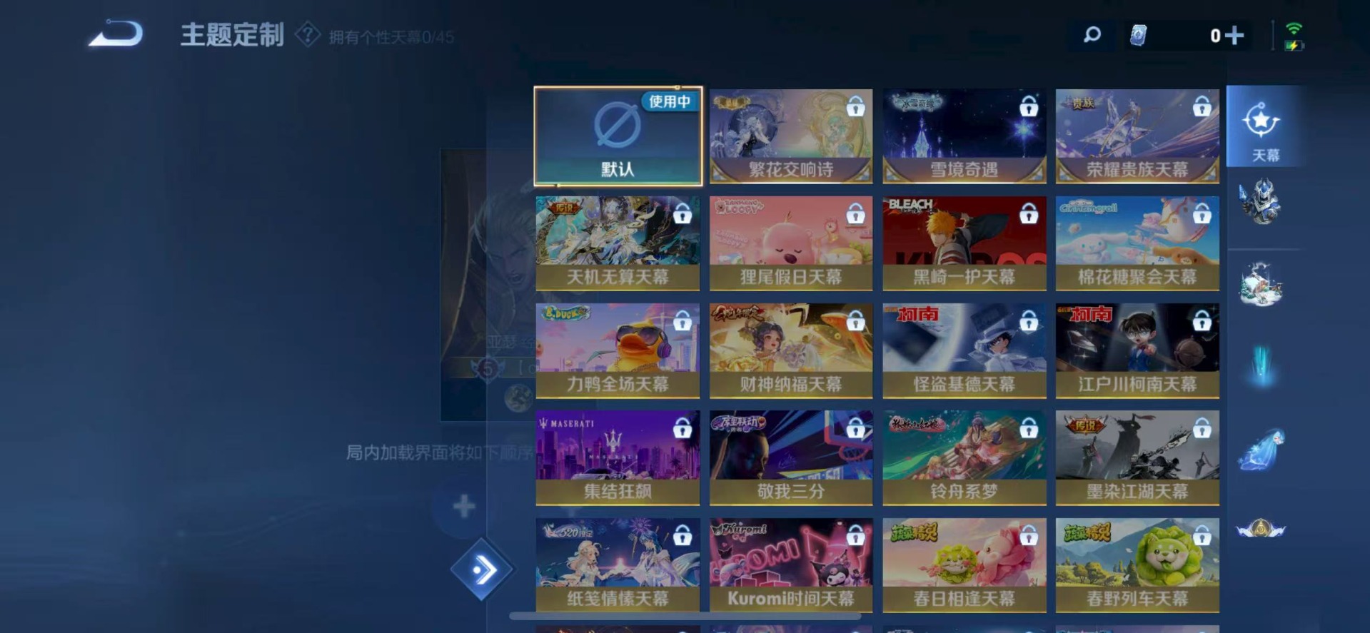 高渐离燃音魔法,海诺心动手记,夏侯惇乘风破浪,阿轲节奏热浪,铠曙光守护者,廉颇地狱岩魂,伽罗琥珀纪元,小乔缤纷独角兽,孙尚香时之恋人,赵怀真器灵·浮梦炉,露娜紫霞仙子,吕布末日机甲,诸葛亮黄金分割率,司马懿暗渊魔法,宫本武藏鬼剑武藏,兰陵王暗隐猎兽者,花木兰水晶猎龙者,李白千年之狐,安琪拉心灵骇客,杨戬天秀·启明,白起星夜王子,嬴政暗夜贵公子,程咬金功夫厨神,百里玄策热力回旋,百里守约特工魅影,墨子金属风暴,澜赏金猎手,王昭君偶像歌手