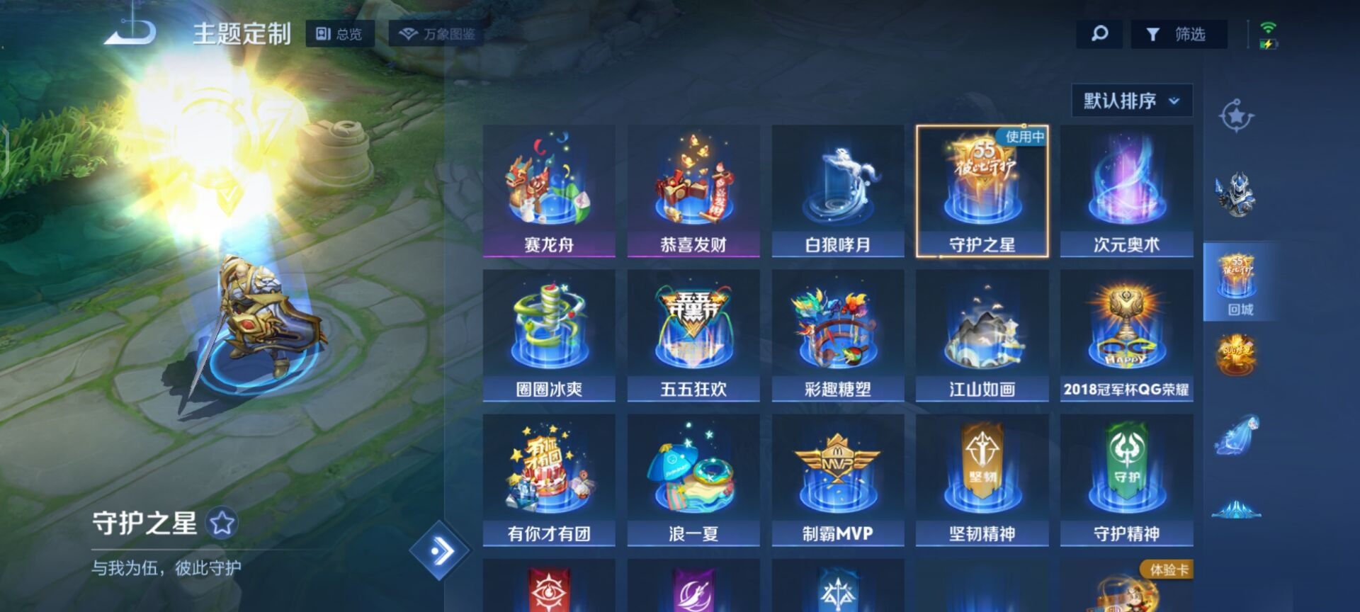 夏侯惇朔风刀,老夫子醍醐杖,沈梦溪星空之诺,盾山御銮,曹操烛龙,典韦穷奇,典韦蓝屏警告,达摩沙漠行僧,牛魔御旌,鲁班七号狮舞东方,元歌云间偶戏,裴擒虎擒涛扼浪,鲁班大师探海日志,明世隐疑决卦,蒙犽狂想玩偶喵,马可波罗暗影游猎,鬼谷子原初探秘者,张良古海寻踪,女娲朔望之晖,桑启海盐诗旅,狄仁杰万华元夜,芈月重明,程咬金演武夺筹,李元芳银河之约,弈星混沌棋,米莱狄御霄,钟馗神迹守卫,钟馗驱傩正仪,狂铁御狮,太乙真人饕餮
