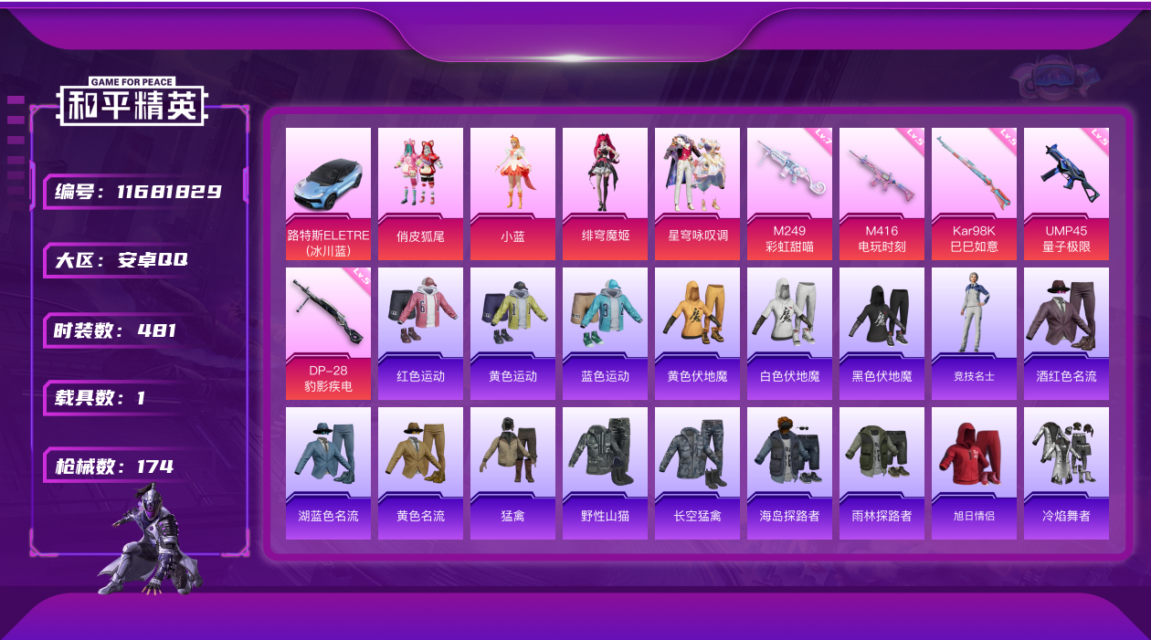 [11681829]4粉装 5特效枪 1载具 11印记 可二次 可修改实名 优质装备:路特斯ELETRE(冰川蓝),俏皮狐尾,M249彩虹甜喵(M249-彩虹甜喵),七级M249-彩虹甜喵,M416电玩时刻,UMP45量子极限,星穹咏叹调,绯穹魔姬,Kar98K-巳巳如意 热门装扮:小蓝 稀有枪皮:DP-28-豹影疾电 五级特效枪:五级UMP45-量子极限,五级Kar98K-巳巳如意,五级DP-28-豹影疾电,五级M416-电玩时刻 紫色装扮:SS22特训,孙悟空,SS23特训,娇憨猪猪,俏皮奶喵,萌趣咩咩,SS21特训,SS31特训套装,人气偶像,冰川特警,冷焰舞者,霓虹热舞,旭日情侣,极速光影,SS30特训套装,云朵鹅,雪绒豹,SS33特训套装,顶瓜瓜,混沌火种,SS20特训,时空追击者,飞驰魅影,音速流光,极速竞梦,SS19特训,水晶王族,酒红色名流,野性山猫,长空猛禽,雨林探路者,霓虹街区,风暴特警,缤纷果语,蓝彩潮人,蓝色运动,街头潮人,飞行日记,魅力单车,麻辣教官,黄色伏地魔,黄色名流,黄色运动,黑色伏地魔,龙的传人,龟仙人,香桃花海,柠萌假日,沙漠兵团,海岛探路者,深蓝色名流,幻影武者,完美偶像,帅气教官,幻世战舞者,探宝勇士,湖蓝色名流,白色伏地魔,破晓战魂,破蛋小黄鸡,空岛之星,竞技达人朋克,红色运动,甜蜜熊情侣,王牌教练,牛气冲天,炫蓝之夏,牛气满满,猛禽,特殊使命,特训学院,先驱飞行员,纯真浪花,热情海星,SS28特训,卖崽青蛙,创世·追猎,冰公主,鱼渊荷华,玉兔迎春,燕燕于飞,巳巳如意,青团波波,糖糖葫芦,棉花软糖,竞技名士,情公主,惊鸿侠骨,SS24特训(SS24特训套装),SS25特训,锦衣飞扬,粉红小猪,宝石天鹅,焰鹰斗篷,幻羽潜行,幽夜迷踪,SS27特训,雪晶战甲,Alan Walker,蝶吟花词,浪漫天命,华灯初上,SS26特训,春光漫游,快闪甜心,贝斯之夜,大橘大利,星渊小夜曲,星影赞美诗,耀粉歌者,粉恋花,蓝冰羽,紫幽梦,SS32特训服(SS32特训套装),风舞幻音,萌黄之夏,樱梦幻音,白糯汤圆,果冻柠檬,光之冒险 优质战备:精灵梦叶罗丽降落伞,巴啦啦小魔仙降落伞,炙焰牛王降落伞,恐龙拽拽降落伞,幻彩电音降落伞,冷漠罗丽降落伞,筑梦精灵降落伞,至尊龙雀降落伞,飞行器-齐天大圣,青春物语降落伞