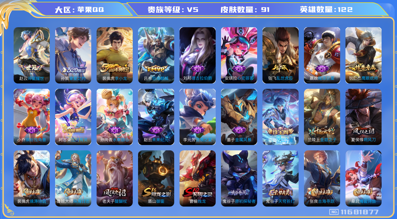 - [11794091]V7 1典藏 12传说 124英雄 238皮肤 可修改实名 女号 优质装备:赤影疾锋,黄金狮子座,黄金射手座,云鹰飞将(小将军),炽阳神光,时之恋人-刘备(电焊工),淬星耀世,超时空战士-狄仁杰,浮生妄,惊梅引,霜月吟 珍宝阁皮:妄想食味,玩趣恶龙 限定皮:逐霄战戟,鸣野蒿,至尊宝,遇见飞天,高山流水,怒海麟威,五谷丰年,梁祝,逐梦之翼,岱宗(典韦年限),孙行者 史诗皮:鸭鸭历险记-刘禅,器灵·浮梦炉,化蝶舞,星界战将,龙之律动,茶境仙,破空之剑,蒙犽顽岩魄,芈月浮光幕影,蔬乡物语(鲁班七号),超元猎域,百相守梦-百里守约,星界特工,紫霞仙子,白龙吟,特工魅影,千年之狐,永昼,江河有灵,百解令(蒙犽),高渐离燃音魔法,冰冠公主,猫狗日记-孙策,乱世虎臣,节奏热浪,女仆咖啡,摇滚巨星,水果甜心,绅士熊喵,星夜王子,心灵骇客,功夫厨神,暗隐猎兽者,幽灵船长,鬼剑武藏,暗渊魔法,心灵战警,乐园奇幻夜,地狱岩魂,纤云弄巧,缤纷独角兽,乘风破浪,逐浪之夏,水晶猎龙者,曙光守护者,金属风暴,原初追逐者,鹰眼统帅,魅力维加斯,无心,未来纪元-赵云