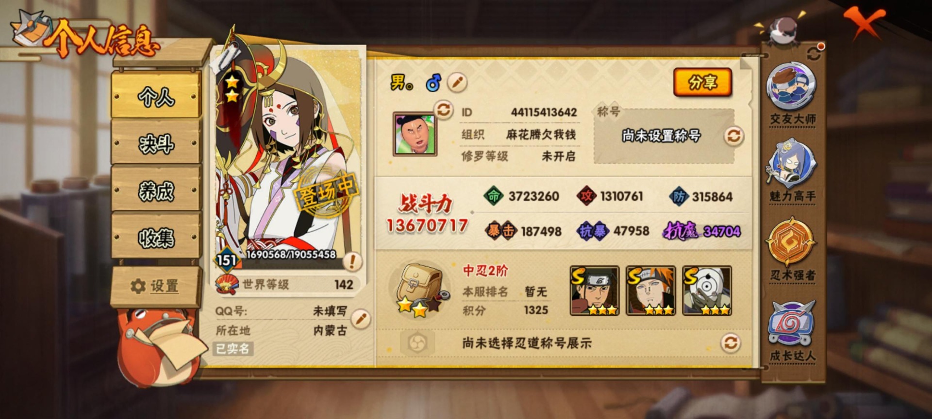 [11681881]V12 24S忍 52A忍 20通灵 1367W战力 可二次 可修改实名 优质装备:熊猫,宇智波鼬「秽土转生」,药师兜「仙人模式」,宇智波斑「秽土转生」,艾「三代目雷影」,千手扉间「秽土转生」,纲手「百豪」,无「二代目土影」,波风水门「秽土转生」,猿飞日斩「秽土转生」,千手柱间,宇智波带土 「忍界大战」,“宇智波斑” 「白面具」,漩涡鸣人 「九喇嘛连结」,宇智波佐助「永恒万花筒」,千手柱间·木叶创立,宇智波斑「秽土转生·解」,大筒木桃式,艾「忍界大战」 S级忍者:自来也 「舞之豪杰」,佩恩「天道」,猿飞日斩,波风水门,大蛇丸,纲手