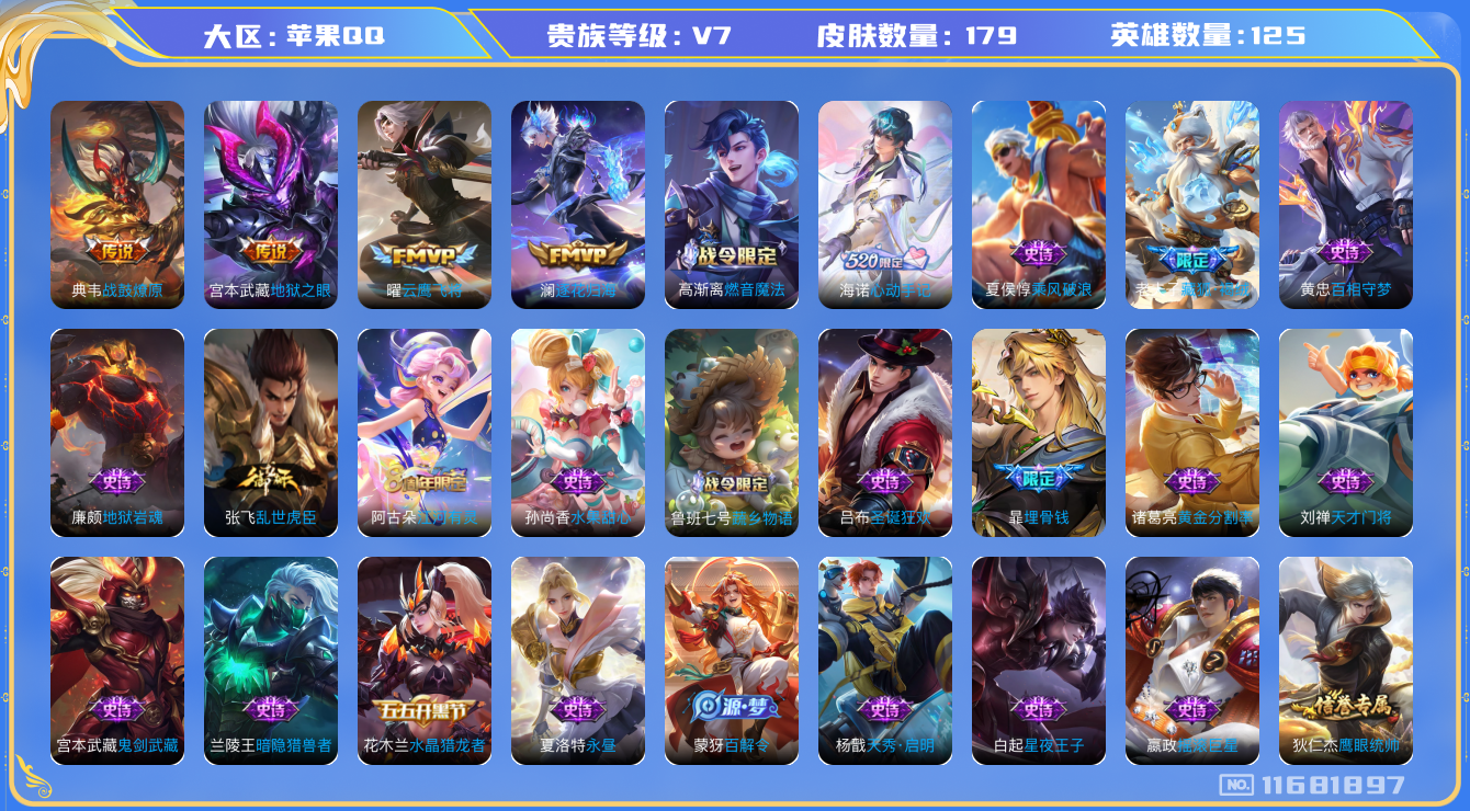 [11681897]V7 4传说 125英雄 179皮肤 可修改实名 连体和平 优质装备:云鹰飞将(小将军),地狱之眼,澜逐花归海 传说皮:典韦战鼓燎原 珍宝阁皮:万物之道,玩趣恶龙 史诗皮:龙之律动,藏狐·褐绒,海诺心动手记,埋骨钱,蔬乡物语(鲁班七号),百相守梦-黄忠,黄金分割率,特工魅影,永昼,江河有灵,百解令(蒙犽),高渐离燃音魔法,蒙恬荣光圣徽,偶像歌手,晚萤,冰冠公主,乱世虎臣,修罗,女仆咖啡,摇滚巨星,水果甜心,天才门将,星夜王子,暗隐猎兽者,鬼剑武藏,天秀·启明,地狱岩魂,纤云弄巧,拒霜思,乘风破浪,水晶猎龙者,金属风暴,圣诞狂欢,鹰眼统帅,魅力维加斯,黎明之约,未来纪元-赵云