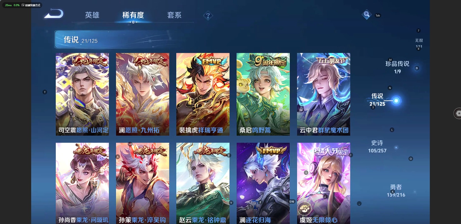 刘备时之恋人,赵云乘龙·铭钟鼎,李信一念神魔,孙策挚爱之约,孙策乘龙·淬吴钩,孙尚香乘龙·问璇玑,裴擒虎祥瑞亨通,曜云鹰飞将,云中君群星魔术团,澜逐花归海