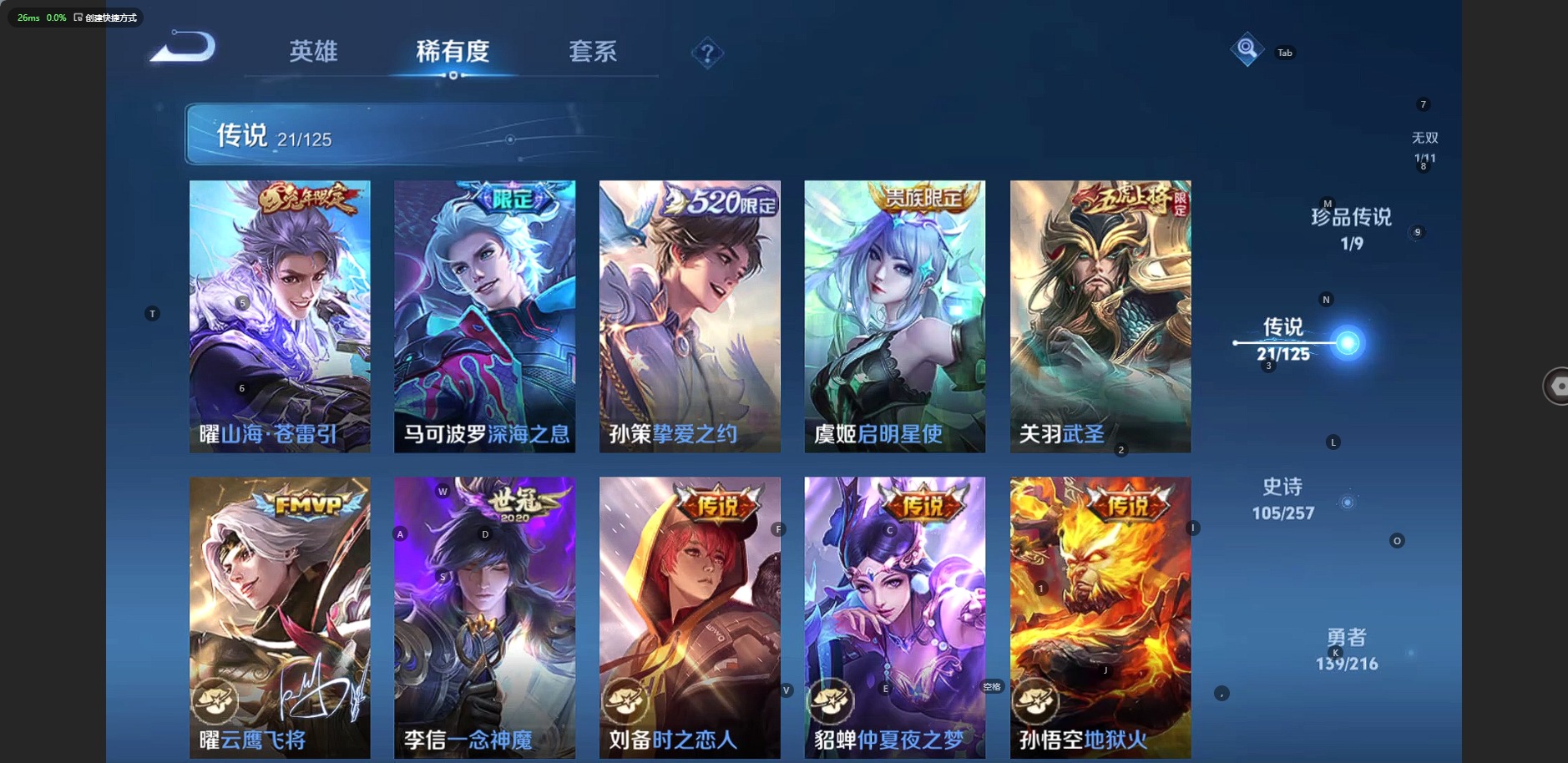 - [12076349]V7 5传说 122英雄 158皮肤 可修改实名 优质装备:黄金白羊座,猫影幻舞,云霓雀翎,仲夏夜之梦(大飞蛾),游龙清影(小青龙),涂山容容 珍宝阁皮:女武神 限定皮:遇见飞天,幽恒(沐浴露),梁祝,天狼绘梦者,李小龙,一生所爱 史诗皮:化蝶舞,遇见神鹿,紫霞仙子,魅语,无限星赏官,晚萤,猫狗日记-大乔,乱世虎臣,水果甜心,德古拉伯爵,鬼剑武藏,诗语江南,繁星吟游(呼啦呼啦),拒霜思,缤纷独角兽,逐浪之夏,水晶猎龙者,金属风暴,鹰眼统帅,魅力维加斯