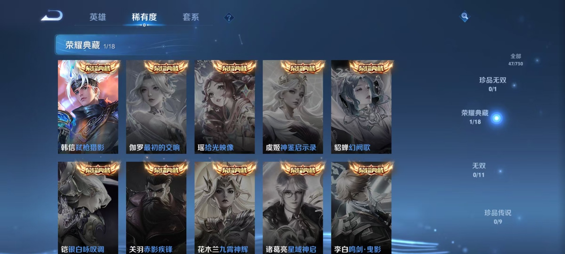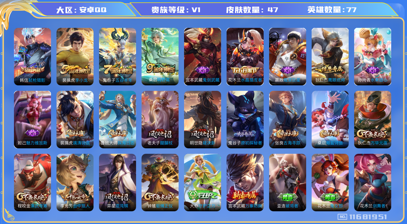[11681951]V1 1典藏 1传说 77英雄 47皮肤 可修改实名 优质装备:弑枪猎影(韩信典藏) 限定皮:鸣野蒿,五谷丰年,李小龙 史诗皮:摇滚巨星,水果甜心,鬼剑武藏,水晶猎龙者,鹰眼统帅,魅力维加斯