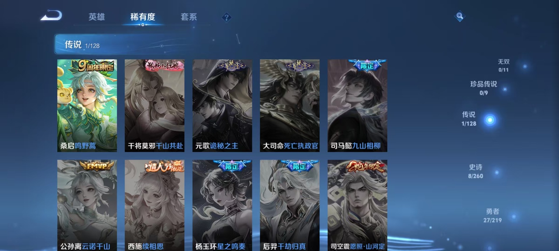 - [12032011]V6 3传说 124英雄 138皮肤 可修改实名 优质装备:云鹰飞将(小将军),云霓雀翎 珍宝阁皮:优雅恋人 限定皮:凤求凰(白切鸡),五谷丰年,梁祝,天狼狩猎者,烈魂,李小龙,朱雀志(守约年限),如梦令-后羿,霸王别姬-项羽,默契交锋-花木兰 史诗皮:黄金分割率,冰冠公主,偶像歌手,节奏热浪,修罗,女仆咖啡,水果甜心,星夜王子,暗隐猎兽者,鬼剑武藏,繁星吟游(呼啦呼啦),乘风破浪,圣诞狂欢,圣诞恋歌,鹰眼统帅,暗夜贵公子,魅力维加斯,未来纪元-赵云