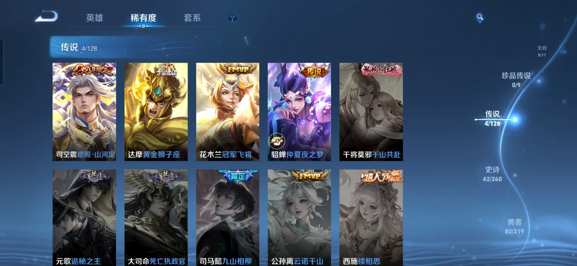 夏侯惇乘风破浪,曹操幽灵船长,小乔缤纷独角兽,孙策猫狗日记,鲁班七号电玩小子,吕布末日机甲,刘禅天才门将,刘禅绅士熊喵,宫本武藏鬼剑武藏,貂蝉圣诞恋歌,花木兰水晶猎龙者,李白千年之狐,亚瑟心灵战警,嬴政摇滚巨星,嬴政暗夜贵公子,程咬金功夫厨神,韩信白龙吟,李元芳逐浪之夏,墨子龙骑士,墨子金属风暴,橘右京修罗