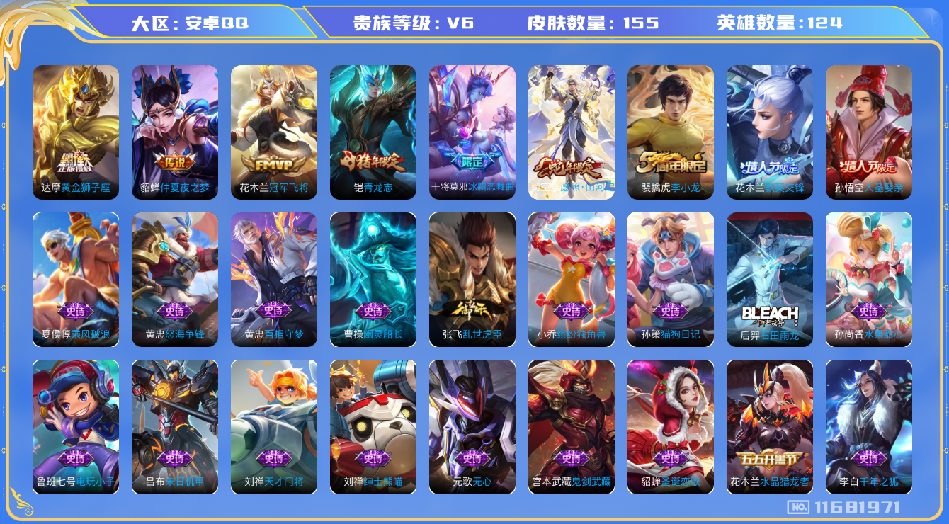 - [11295879]V6 7传说 123英雄 200皮肤 可修改实名 优质装备:猫影幻舞,超时空战士-狄仁杰,挚爱之约,无双飞将,鹤羽星尊,澜逐花归海 珍宝阁皮:妄想食味,玩趣恶龙 限定皮:鸣野蒿,高山流水,五谷丰年,青龙志(铠年限),游园惊梦,梁祝,天狼狩猎者,李小龙,山海·玄木吟(马可年限) 史诗皮:化蝶舞,星界特工,星界战将,百相守梦-黄忠,黄金分割率,特工魅影,千年之狐,电玩·爆裂旋风,江河有灵,蒙恬荣光圣徽,冰冠公主,末日机甲-吕布,猫狗日记-孙策,节奏热浪,摇滚巨星,水果甜心,天才门将,星夜王子,德古拉伯爵,幽灵船长,鬼剑武藏,心灵战警,天秀·启明,舞动绿茵,繁星吟游(呼啦呼啦),缤纷独角兽,逐浪之夏,水晶猎龙者,曙光守护者,箭羽风息,金属风暴,原初追逐者,圣诞狂欢,圣诞恋歌,鹰眼统帅,天秀·音浪,无心,未来纪元-赵云