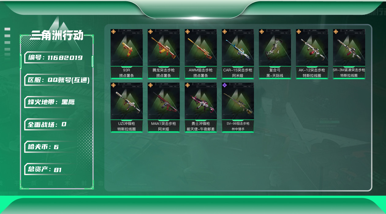 [11682019]总资产:81.3M 10传说枪械 哈夫币:6.113K 可二次 可修改实名 烽火地带段位:黑鹰 全面战场段位:尉官 传说武器皮肤:M4A1突击步枪-阿米娅,CAR-15突击步枪-阿米娅,复合弓-黑-天际线,AWM狙击步枪-捞点薯条,腾龙突击步枪-捞点薯条,93R-捞点薯条,AK-12突击步枪-特斯拉线圈,SR-3M紧凑突击步枪-特斯拉线圈,UZI冲锋枪-特斯拉线圈,勇士冲锋枪-能天使-午夜邮差 史诗武器皮肤:SV-98狙击步枪-林中猎手