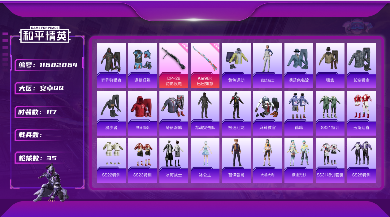 [11682064]2特效枪 可二次 可修改实名 优质装备:奇异狩猎者,Kar98K-巳巳如意 热门装扮:迅捷狂鲨 稀有枪皮:DP-28-豹影疾电 五级特效枪:五级DP-28-豹影疾电 四级特效枪:四级Kar98K-巳巳如意 紫色装扮:SS22特训,SS23特训,SS21特训,SS31特训套装,旭日情侣,极速光影,长空猛禽,鹤鸣,麻辣教官,黄色运动,冰河战士,龙魂突击队,极速红龙,湖蓝色名流,绮丽涂鸦,猛禽,SS28特训,冰公主,玉兔迎春,竞技名士,智谋强哥,大橘大利,漫步者 优质战备:鬼刀降落伞,旋转彩虹降落伞,环太平洋降落伞,未来战士降落伞,飞行器-春暖花开