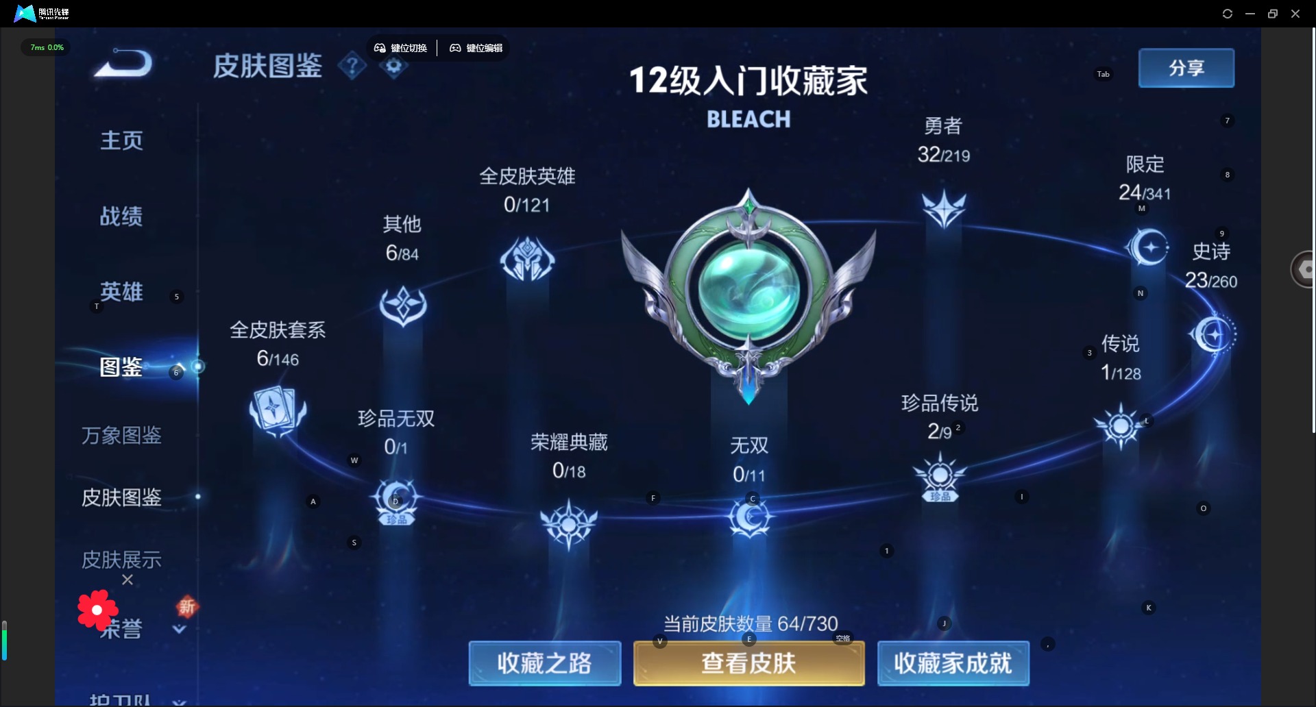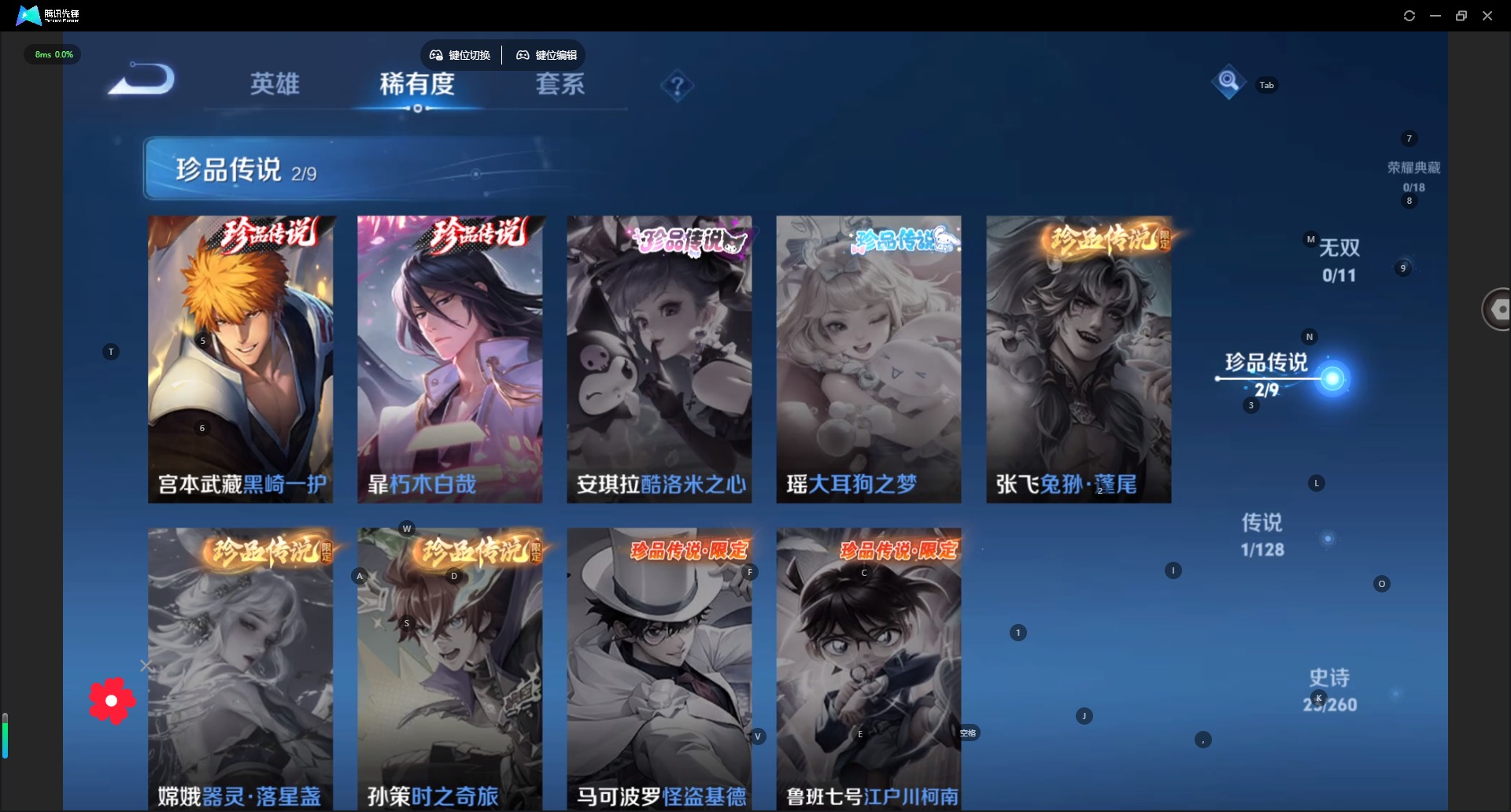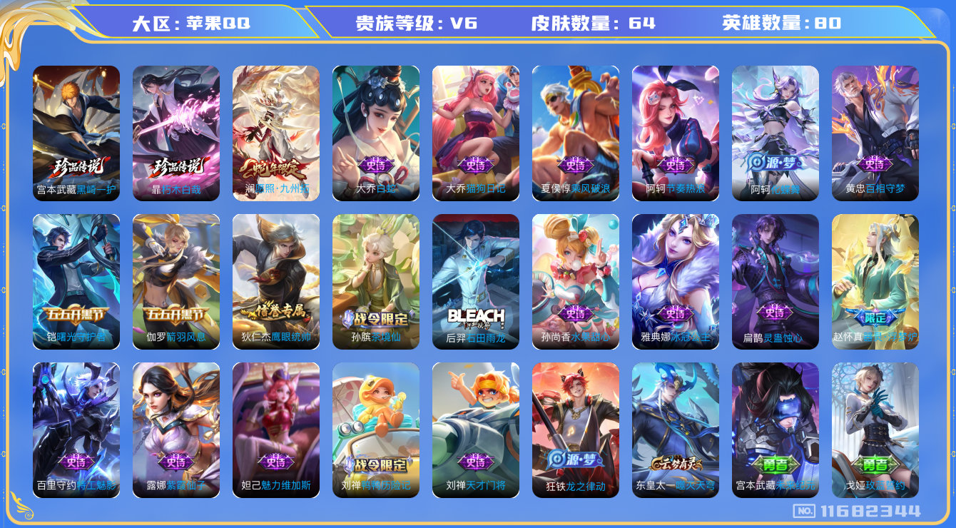 [11682344]V6 2珍品传说 1传说 80英雄 64皮肤 可修改实名 女号 优质装备:朽木白哉,黑崎一护 限定皮:愿照·九州拓(澜年限) 史诗皮:鸭鸭历险记-刘禅,器灵·浮梦炉,化蝶舞,灵蛊蚀心,龙之律动,石田雨龙,茶境仙,百相守梦-黄忠,紫霞仙子,特工魅影,冰冠公主,白蛇,猫狗日记-大乔,节奏热浪,水果甜心,天才门将,乘风破浪,曙光守护者,箭羽风息,鹰眼统帅,魅力维加斯