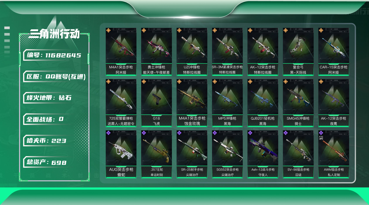 [11682645]总资产:698.1M 3干员外观 14传说枪械 哈夫币:223K 顶级安全箱(3×3)9.15号到期 可二次 可修改实名 烽火地带段位:钻石 全面战场段位:校官 传说武器皮肤:AK-12突击步枪-夜鹰,G18-飞虎,SMG45冲锋枪-骑士,M4A1突击步枪-阿米娅,CAR-15突击步枪-阿米娅,复合弓-黑-天际线,AK-12突击步枪-特斯拉线圈,SR-3M紧凑突击步枪-特斯拉线圈,UZI冲锋枪-特斯拉线圈,勇士冲锋枪-能天使-午夜邮差,725双管霰弹枪-送葬人-无题密令,MP5冲锋枪-黑海,QJB201轻机枪-黑海,M4A1突击步枪-蚀金玫瑰 史诗武器皮肤:AWM狙击步枪-私人定制(典藏),AUG突击步枪-蝮蛇,Ash-12战斗步枪-守夜人,M16A4突击步枪-竞赛选手,SG552突击步枪-尖端治疗,SR-25射手步枪-尖端治疗,.357左轮-幸运时刻,SVD狙击步枪-荒野求生,SV-98狙击步枪-囚徒,腾龙突击步枪-无垢,MP7冲锋枪-无垢,Vector冲锋枪-阿萨拉文明 干员外观:红狼-蚀金玫瑰,蜂医-送葬人·无题密令(S5),露娜-黑·天际线