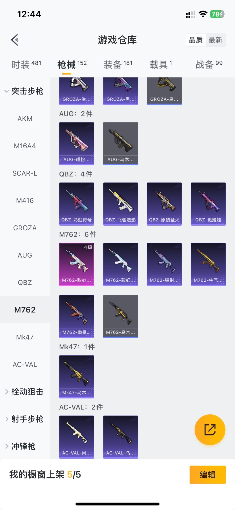 AKM-绿萝繁花,SCAR-L-青春物语,M416-五爪金龙,GROZA-焦糖拿铁,M762-甜心娃娃,AWM-橘柚倾心