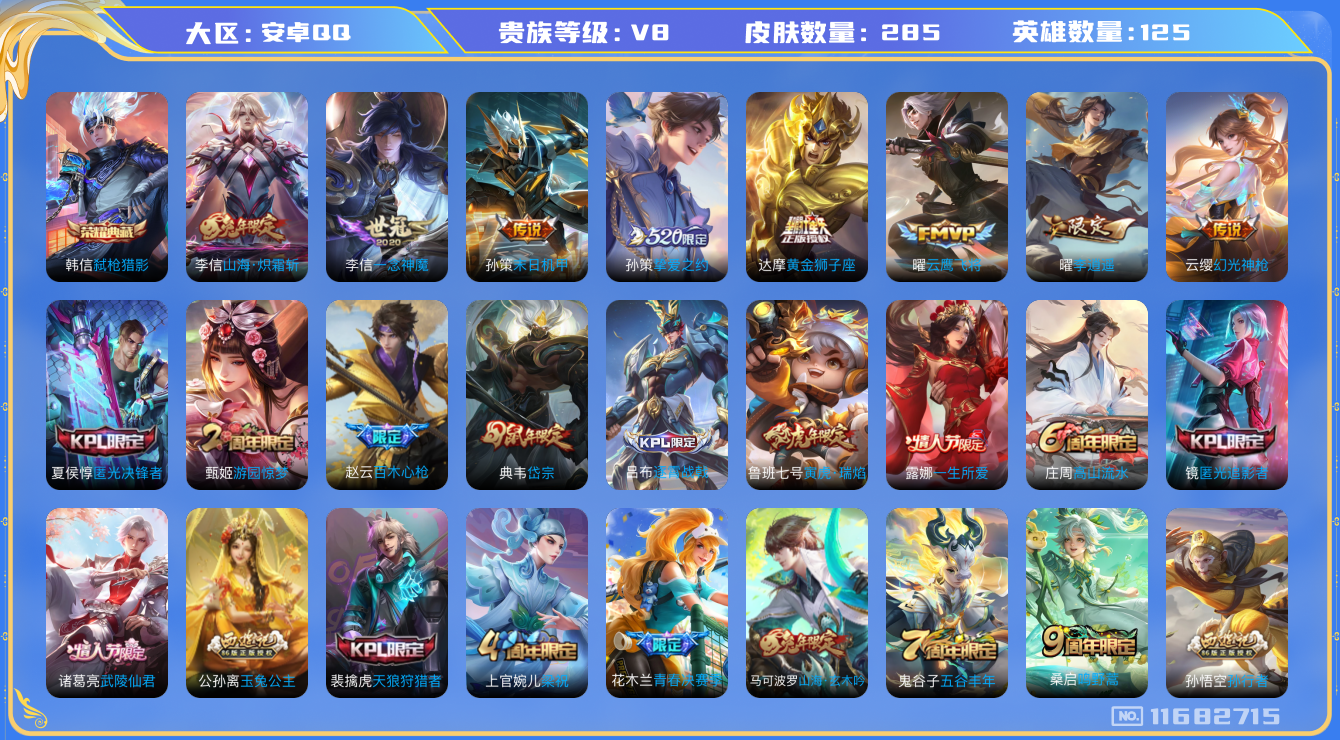 [11682715]V8 1典藏 14传说 125英雄 285皮肤 可修改实名 荣耀水晶:弑枪猎影(韩信典藏) 传说皮:幻光神枪,李逍遥,山海·炽霜斩(李信年限),黄金狮子座,一念神魔,云鹰飞将(小将军),末日机甲-孙策,挚爱之约 珍宝阁皮:妄想食味,玩趣恶龙 限定皮:愿照·九州拓(澜年限),逐霄战戟,鸣野蒿,武陵仙君(小桃花),傲雪梅枪,飞衡(韩信年限),高山流水,匿光决锋者,五谷丰年,游园惊梦,梁祝,天狼狩猎者,岱宗(典韦年限),逐梦之影,朱雀志(守约年限),孙行者,一生所爱,青春决赛季,美猴王,匿光追影者,寅虎·瑞焰(虎皮蛋子),时之祈愿-云中君,百木心枪,玉兔公主,枫霜尽,山海·玄木吟(马可年限) 史诗皮:星界战将,器灵·浮梦炉,龙之律动,化蝶舞,紫霞仙子,苍穹之光,白龙吟,黄金分割率,特工魅影,千年之狐,永昼,江河有灵,高渐离燃音魔法,百解令(蒙犽),蒙恬荣光圣徽,冰冠公主,偶像歌手,晚萤,魅语,电玩·爆裂旋风,暗夜猫娘,龙骑士(小龙虾),末日机甲-吕布,猫狗日记-孙策,猫狗日记-大乔,乱世虎臣,节奏热浪,修罗,女仆咖啡,摇滚巨星,水果甜心,星夜王子,心灵骇客,功夫厨神,德古拉伯爵,暗隐猎兽者,幽灵船长,鬼剑武藏,心灵战警,舞动绿茵,地狱岩魂,纤云弄巧,拒霜思,乘风破浪,逐浪之夏,水晶猎龙者,曙光守护者,金属风暴,原初追逐者,圣诞狂欢,圣诞恋歌,鹰眼统帅,暗夜贵公子,魅力维加斯,黎明之约,天秀·音浪,无心,未来纪元-赵云