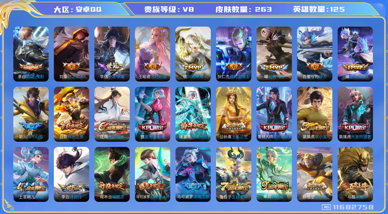 [11682758]V8 1典藏 14传说 125英雄 263皮肤 可修改实名 优质装备:鸣剑·曳影,云鹰飞将(小将军),炽阳神光,一念神魔,乞巧织情,时之恋人-刘备(电焊工),超时空战士-狄仁杰,碎云,澜逐花归海,涂山容容 珍宝阁皮:胡桃夹子,蔷薇恋人 限定皮:鸣野蒿,傲雪梅枪,时雨天司(水龙头),神威(电光马子),瑞麟志(木兰年限),高山流水,诗剑行,五谷丰年,梁祝,天狼狩猎者,李小龙,朱雀志(守约年限),辉光之辰,孙行者,匿光追影者,百木心枪,玉兔公主,深海之息(深海大菠萝),枫霜尽,匿光启智者,山海·玄木吟(马可年限) 史诗皮:星界战将,龙之律动,百相守梦-周瑜,炽弈燎原,破空之剑,战舞者,蒙犽顽岩魄,百相守梦-黄忠,紫霞仙子,电玩小子(小书包),黄金分割率,特工魅影,千年之狐,永昼,江河有灵,魅语,蒙恬荣光圣徽,偶像歌手,晚萤,电玩·爆裂旋风,末日机甲-吕布,猫狗日记-孙策,猫狗日记-大乔,节奏热浪,修罗,摇滚巨星,水果甜心,绅士熊喵,星夜王子,心灵骇客,时之奇旅-安琪拉,德古拉伯爵,暗隐猎兽者,幽灵船长,鬼剑武藏,心灵战警,舞动绿茵,地狱岩魂,乘风破浪,逐浪之夏,水晶猎龙者,曙光守护者,热力回旋,箭羽风息,金属风暴,原初追逐者,圣诞狂欢,圣诞恋歌,鹰眼统帅,暗夜贵公子,黎明之约,赏金猎手,无心,未来纪元-赵云
