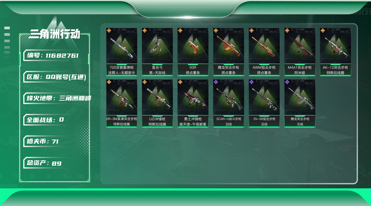 - [11714839]总资产:193.8M 10传说枪械 哈夫币:18.719K 可二次 可修改实名 优质装备:顶级安全箱(3x3) 烽火地带段位:钻石 全面战场段位:列兵 传说武器皮肤:UZI冲锋枪-特斯拉线圈,AWM狙击步枪-捞点薯条,腾龙突击步枪-捞点薯条,93R-捞点薯条,AK-12突击步枪-特斯拉线圈,SR-3M紧凑突击步枪-特斯拉线圈,勇士冲锋枪-能天使-午夜邮差,复合弓-黑-天际线,M4A1突击步枪-阿米娅,CAR-15突击步枪-阿米娅