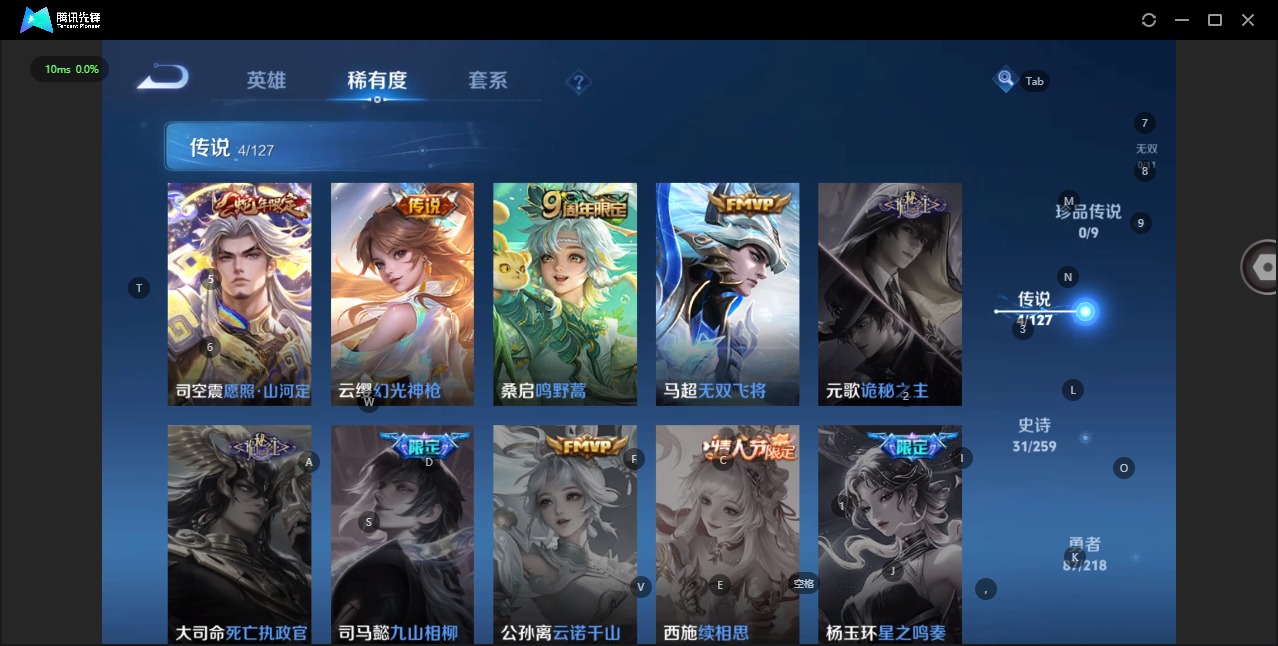 - [11606246]V6 2传说 122英雄 144皮肤 可修改实名 优质装备:末日机甲-孙尚香(绿蚂蚱),地狱火 珍宝阁皮:胡桃夹子 限定皮:五谷丰年,天狼狩猎者,李小龙,大圣娶亲,百木心枪 史诗皮:黄金分割率,龙骑士(小龙虾),猫狗日记-孙策,水果甜心,功夫厨神,纤云弄巧,乘风破浪,曙光守护者,金属风暴,鹰眼统帅,魅力维加斯