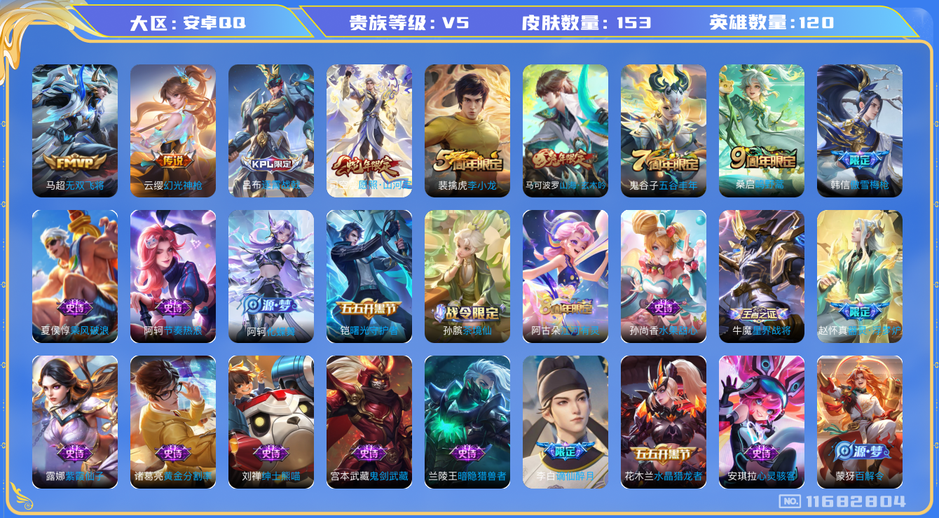 [11682804]V5 4传说 120英雄 153皮肤 可修改实名 优质装备:无双飞将 传说皮:幻光神枪 珍宝阁皮:胡桃夹子 限定皮:愿照·山河定(司空震年限),逐霄战戟,鸣野蒿,傲雪梅枪,五谷丰年,李小龙,山海·玄木吟(马可年限) 史诗皮:器灵·浮梦炉,化蝶舞,星界战将,茶境仙,谪仙醉月,紫霞仙子,黄金分割率,江河有灵,百解令(蒙犽),节奏热浪,摇滚巨星,水果甜心,绅士熊喵,心灵骇客,暗隐猎兽者,鬼剑武藏,乐园奇幻夜,拒霜思,乘风破浪,水晶猎龙者,曙光守护者,金属风暴,鹰眼统帅,魅力维加斯,赏金猎手,未来纪元-赵云