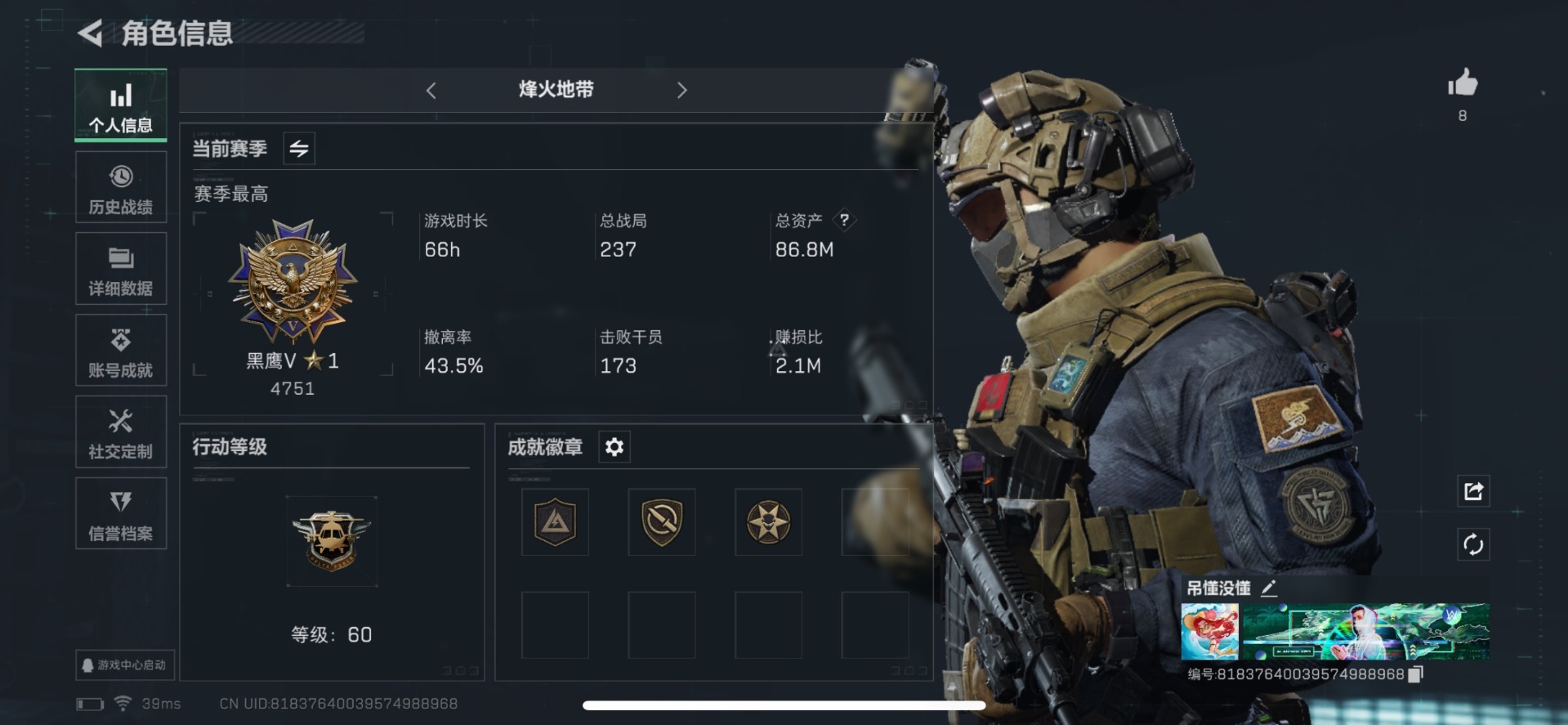 - [11489199]总资产:179.8M 3干员外观 2近战传说 21传说枪械 哈夫币:57.480K 高级安全箱(9.17到期) 可二次 可修改实名 优质装备:近战-怜悯,近战-影锋,AUG突击步枪-气象感应(典藏) 烽火地带段位:钻石 全面战场段位:上等兵 传说武器皮肤:SR-25射手步枪-水墨云图,M1014霰弹枪-影锋,AWM狙击步枪-影锋,SCAR-H战斗步枪-铁艺苍穹,CAR-15突击步枪-阿米娅,复合弓-黑-天际线,AWM狙击步枪-捞点薯条,腾龙突击步枪-捞点薯条,93R-捞点薯条,AK-12突击步枪-特斯拉线圈,SR-3M紧凑突击步枪-特斯拉线圈,UZI冲锋枪-特斯拉线圈,勇士冲锋枪-能天使-午夜邮差,725双管霰弹枪-送葬人-无题密令,M7战斗步枪-神秘艺术,M7战斗步枪-维京,M7战斗步枪-怜悯,ASh-12战斗步枪-怜悯 史诗武器皮肤:QBZ95-1突击步枪-ACE,M4A1突击步枪-特勤执行,AUG突击步枪-特勤执行,PTR-32战斗步枪-ACE,SKS射手步枪-ACE,AUG突击步枪-蝮蛇,M700狙击步枪-蝮蛇,G3战斗步枪-战场英杰,SVD狙击步枪-暗夜猎手,M16A4突击步枪-竞赛选手,勇士冲锋枪-深海恐惧,AKM突击步枪-林中猎手,SR-3M紧凑突击步枪-荒野求生,M1014霰弹枪-林中猎手,PTR-32突击步枪-英雄,M250通用机枪-囚徒,腾龙突击步枪-无垢,MP7冲锋枪-无垢,PSG-1射手步枪-无垢,QBZ95-1突击步枪-曙光,UZI冲锋枪-危险实验,M249轻机枪-维京,SCAR-H战斗步枪-危险实验,Vector冲锋枪-阿萨拉文明,PKM通用机枪-英雄,M700狙击步枪-竞技风,QSZ92G-风林火山,93R-博士 干员外观:牧羊人-街头之王,威龙-壮志凌云,蜂医-送葬人·无题密令(S5)