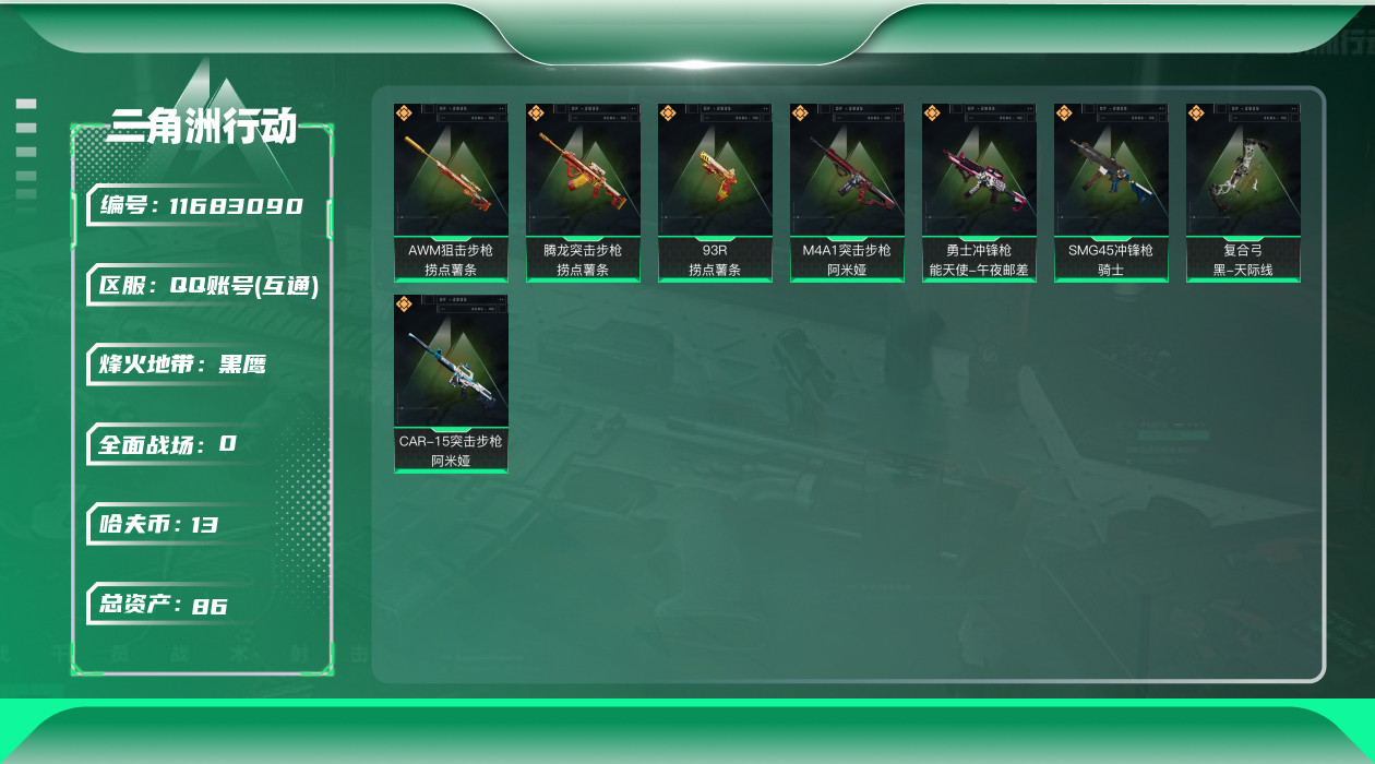 [11683090]总资产:86.8M 8传说枪械 哈夫币:13.498K 进阶安全箱(2×2)9.15号到期 可二次 可修改实名 烽火地带段位:黑鹰 全面战场段位:无段位 传说武器皮肤:SMG45冲锋枪-骑士,M4A1突击步枪-阿米娅,CAR-15突击步枪-阿米娅,复合弓-黑-天际线,AWM狙击步枪-捞点薯条,腾龙突击步枪-捞点薯条,93R-捞点薯条,勇士冲锋枪-能天使-午夜邮差