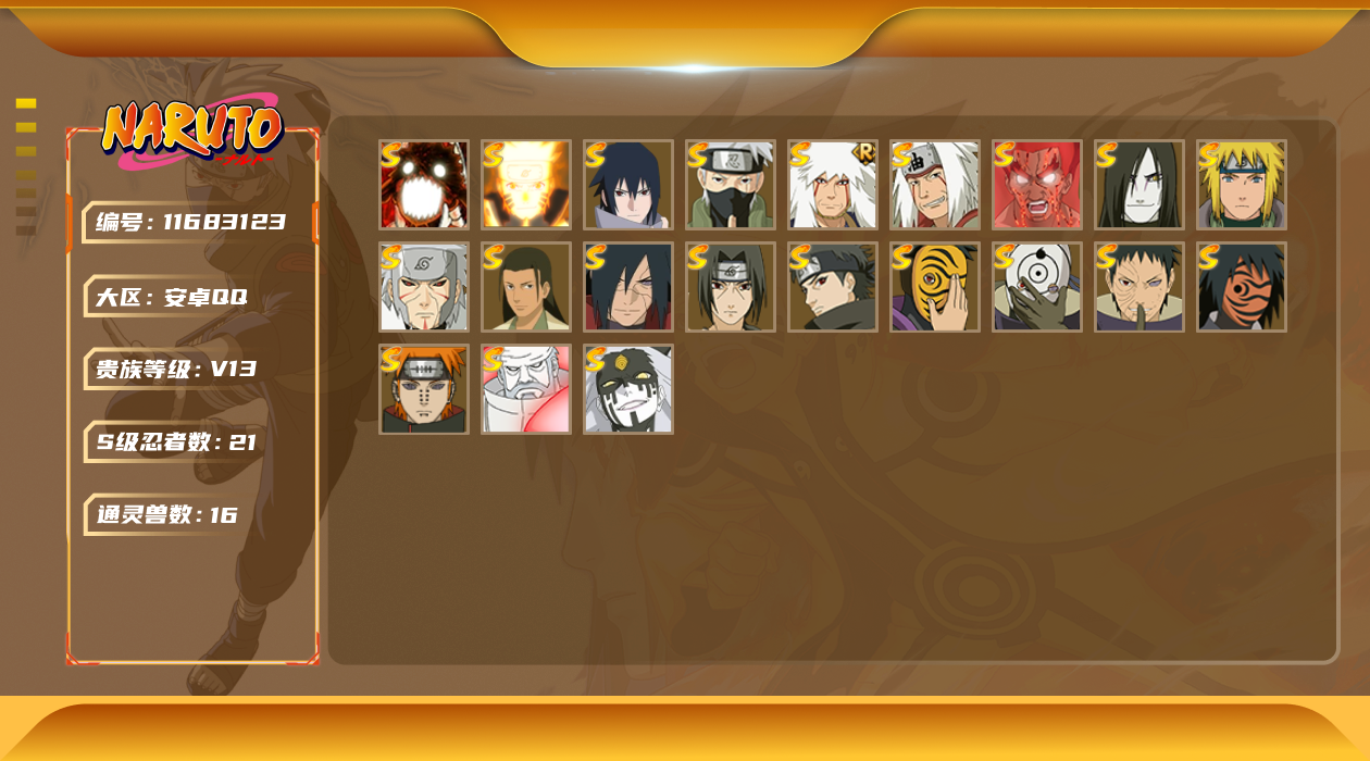 [11683123]V13 21S忍 37A忍 16通灵 688.1W战力 可二次 可修改实名 优质装备:千手扉间「秽土转生」,神秘面具男,迈特凯「死门」,宇智波带土 「忍界大战」,“宇智波斑” 「白面具」,漩涡鸣人 「九喇嘛连结」,大筒木金式「博人传」,神秘面具男 「红夜之刃」,宇智波佐助「永恒万花筒」,千手柱间·木叶创立,宇智波斑「秽土转生·解」,大筒木桃式,宇智波止水「须佐能乎」,旗木卡卡西「须佐能乎」,自来也 「传说中的三忍」,漩涡鸣人 「暴怒·第六尾」 S级忍者:自来也 「舞之豪杰」,宇智波鼬 「须佐能乎」,佩恩「天道」,波风水门,大蛇丸