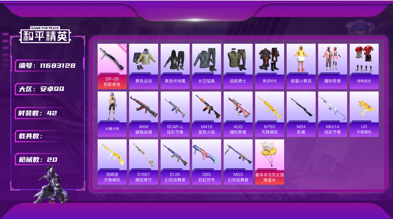 [11683128]1特效枪 1印记 可二次 可修改实名 稀有枪皮:DP-28-豹影疾电 四级特效枪:四级DP-28-豹影疾电 紫色装扮:青涩时光,长空猛禽,超能勇士,黄色运动,黑色伏地魔,破蛋小黄鸡,大橘大利,耀粉歌者,绯格组合 优质战备:喜羊羊与灰太狼降落伞
