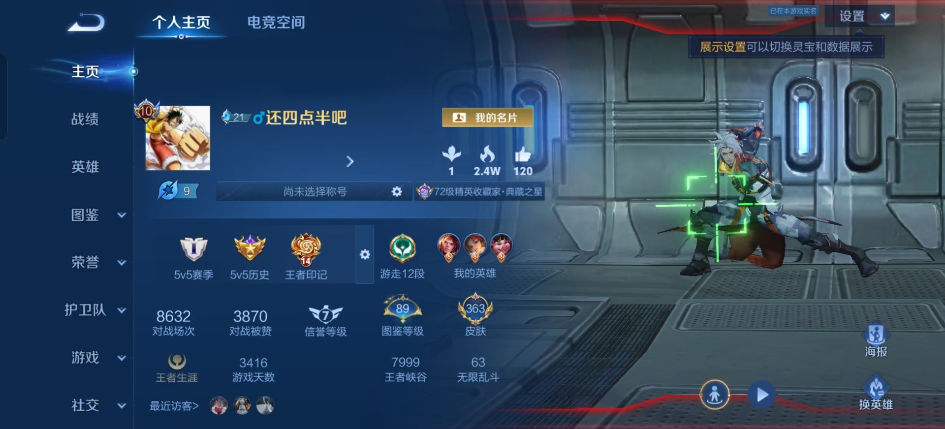 - [12116590]V8 1典藏 23传说 124英雄 330皮肤 可修改实名 优质装备:全息碎影(猴子典藏),黄金狮子座,云鹰飞将(小将军),久胜战神,炽阳神光,一念神魔,末日机甲-孙尚香(绿蚂蚱),地狱火,仲夏夜之梦(大飞蛾),胖达荣荣,末日机甲-孙策,挚爱之约,无双飞将,涂山容容 传说皮:幻光神枪 珍宝阁皮:妄想食味,优雅恋人 限定皮:愿照·九州拓(澜年限),鸣野蒿,至尊宝,白虎志(电光耗子),凤求凰(白切鸡),梅西,武陵仙君(小桃花),傲雪梅枪,补天,魔法小厨娘,神威(电光马子),飞衡(韩信年限),瑞麟志(木兰年限),高山流水,匿光决锋者,青龙志(铠年限),冰锋战神,武圣,梁祝,天狼狩猎者,逐梦之星,李小龙,玄武志(苏烈年限),朱雀志(守约年限),永曜之星,辉光之辰,圣诞老人,孙行者,猪悟能,一生所爱,大圣娶亲,神奇女侠,美猴王,匿光追影者,女儿国国王,玉兔公主,启示之音,唐三藏 史诗皮:化蝶舞,灵蛊蚀心,星界战将,龙之律动,石田雨龙,茶境仙,蔬乡物语(鲁班七号),紫霞仙子,苍穹之光,电玩小子(小书包),白龙吟,黄金分割率,特工魅影,千年之狐,永昼,江河有灵,魅语,蒙恬荣光圣徽,无限星赏官,冰冠公主,偶像歌手,晚萤,暗夜猫娘,末日机甲-吕布,猫狗日记-孙策,乱世虎臣,修罗,女仆咖啡,水果甜心,天才门将,星夜王子,心灵骇客,时之奇旅-安琪拉,德古拉伯爵,暗隐猎兽者,幽灵船长,鬼剑武藏,心灵战警,地狱岩魂,纤云弄巧,繁星吟游(呼啦呼啦),拒霜思,缤纷独角兽,乘风破浪,逐浪之夏,水晶猎龙者,曙光守护者,金属风暴,原初追逐者,圣诞狂欢,圣诞恋歌,鹰眼统帅,黎明之约,赏金猎手,无心,未来纪元-赵云
