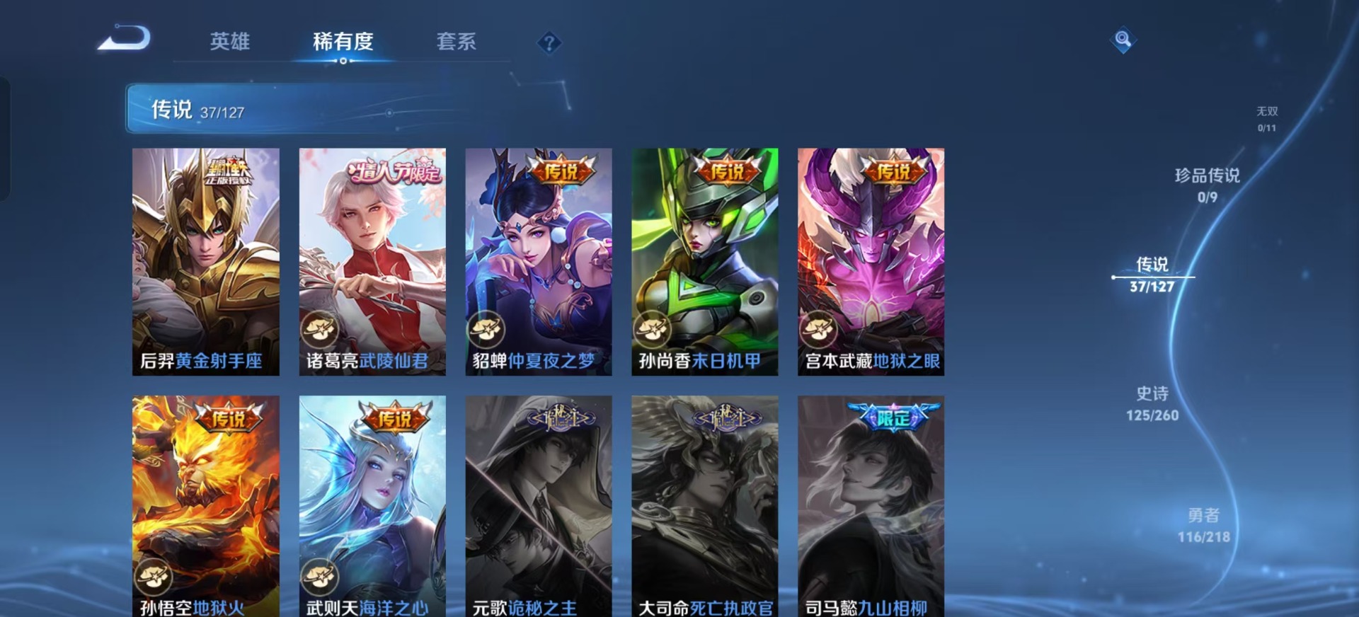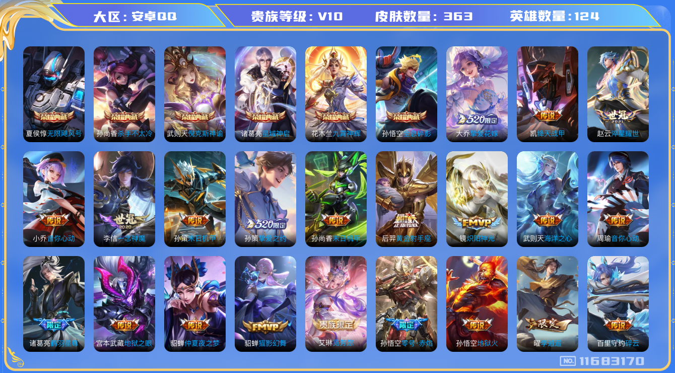 - [12296663]V10 6典藏 1无双 2珍品传说 28传说 126英雄 363皮肤 典藏英雄武则天 可修改实名 优质装备:天鹅之梦(小乔典藏),无限飓风号(高达),杀手不太冷,大秦宣太后,全息碎影(猴子典藏),神鉴启示录,韩信群星魔术团(韩信无双),朽木白哉,黑崎一护,黄金狮子座,黄金射手座,绛天战甲(鸡嘴战神),黄金白羊座,久胜战神,炽阳神光,云霓雀翎,末日机甲-孙尚香(绿蚂蚱),地狱火,仲夏夜之梦(大飞蛾),零号·赤焰,海洋之心,地狱之眼,胖达荣荣,时之恋人-刘备(电焊工),超时空战士-狄仁杰,艾琳觅芳踪 传说皮:云诺千山,幻光神枪 珍宝阁皮:优雅恋人,女武神 限定皮:愿照·山河定(司空震年限),鸣野蒿,白虎志(电光耗子),凤求凰(白切鸡),太华(伽罗年限),时之彼端,魔法小厨娘,神威(电光马子),飞衡(韩信年限),玄嵩(庄周年限),五谷丰年,幽恒(沐浴露),武圣,梁祝,天狼狩猎者,龙胆,烈魂,岱宗(典韦年限),虎魄,天狼征服者,李小龙,永曜之星,如梦令-嫦娥,如梦令-后羿,孙行者,天魔缭乱,神奇女侠 史诗皮:鸭鸭历险记-刘禅,化蝶舞,灵蛊蚀心,龙之律动,雪豹·霜爪,布丁狗之誓,石田雨龙,百相守梦-黄忠,织梦人,遇见神鹿,紫霞仙子,苍穹之光,电玩小子(小书包),白龙吟,黄金分割率,特工魅影,千年之狐,魅语,无限星赏官,冰冠公主,青蛇,偶像歌手,晚萤,暗夜猫娘,龙骑士(小龙虾),末日机甲-吕布,猫狗日记-孙策,猫狗日记-大乔,乱世虎臣,节奏热浪,修罗,女仆咖啡,摇滚巨星,水果甜心,绅士熊喵,天才门将,星夜王子,心灵骇客,功夫厨神,德古拉伯爵,暗隐猎兽者,幽灵船长,鬼剑武藏,心灵战警,舞动绿茵,地狱岩魂,诗语江南,纤云弄巧,繁星吟游(呼啦呼啦),缤纷独角兽,乘风破浪,逐浪之夏,月团寄思,水晶猎龙者,曙光守护者,箭羽风息,金属风暴,原初追逐者,圣诞狂欢,圣诞恋歌,鹰眼统帅,暗夜贵公子,魅力维加斯,黎明之约,未来纪元-赵云