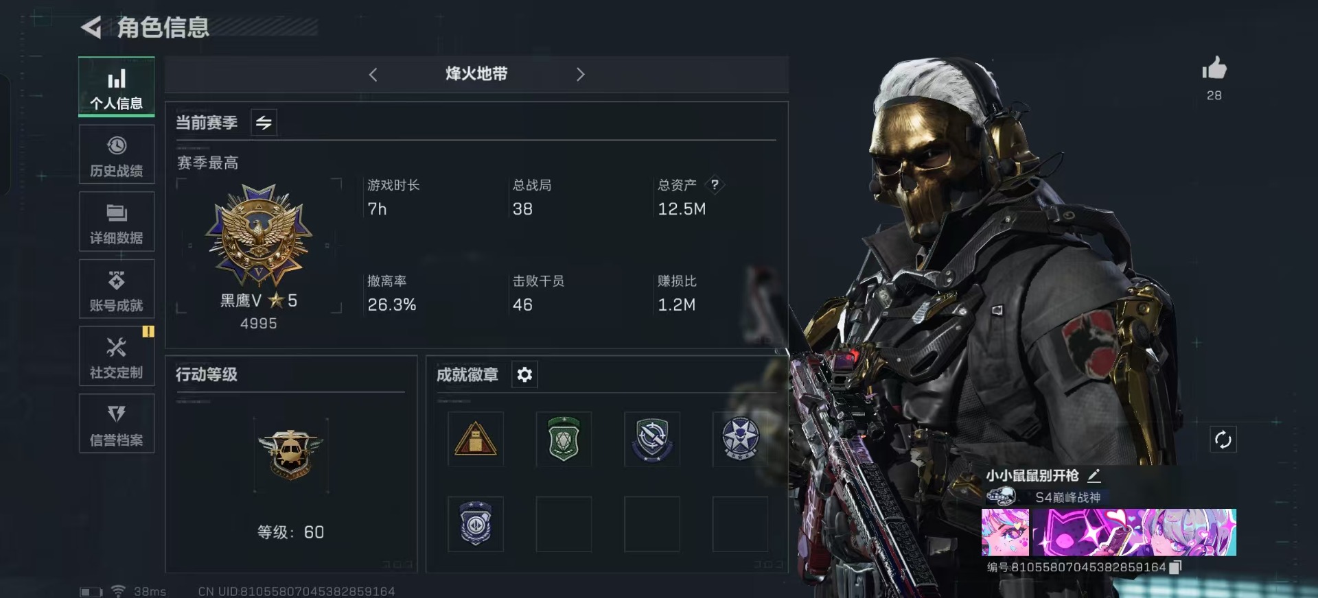 - [12296863]5橙皮 1紫皮 37皮肤 27英雄 94卡面 475已用源晶 铂金 优质装备:狂徒-塑水宗,威龙之刃,判官-千灵华绽,匕首-超限闪存 步枪皮肤:狂徒-堕天遗武 近战武器皮肤:超能偶像 应援棒