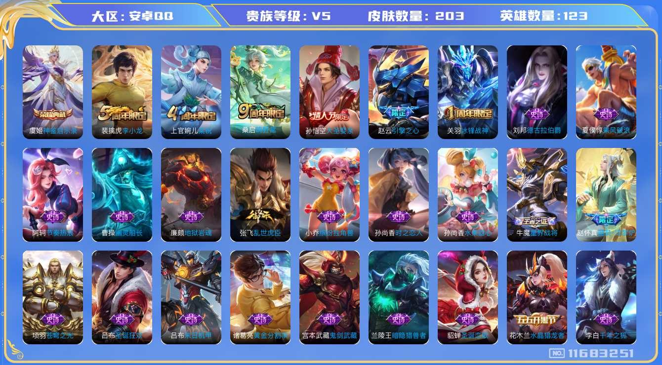 [11683251]V5 1典藏 1传说 123英雄 203皮肤 可修改实名 荣耀水晶:神鉴启示录 珍宝阁皮:女武神 限定皮:鸣野蒿,冰锋战神,梁祝,李小龙,大圣娶亲,引擎之心 史诗皮:星界战将,器灵·浮梦炉,蒙犽顽岩魄,苍穹之光,黄金分割率,特工魅影,千年之狐,蒙恬荣光圣徽,冰冠公主,晚萤,末日机甲-吕布,时之恋人-孙尚香,乱世虎臣,节奏热浪,修罗,摇滚巨星,水果甜心,星夜王子,心灵骇客,德古拉伯爵,暗隐猎兽者,幽灵船长,鬼剑武藏,舞动绿茵,地狱岩魂,纤云弄巧,繁星吟游(呼啦呼啦),缤纷独角兽,乘风破浪,逐浪之夏,水晶猎龙者,金属风暴,原初追逐者,圣诞狂欢,圣诞恋歌,鹰眼统帅,魅力维加斯,黎明之约,未来纪元-赵云