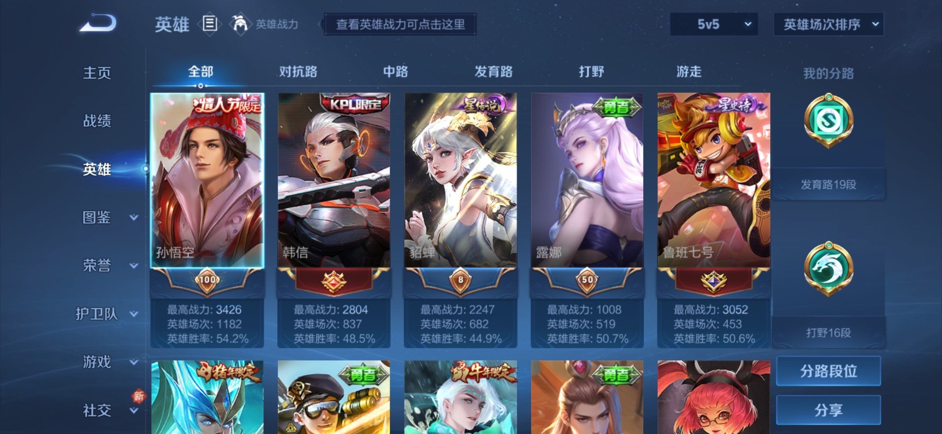 - PX_2091121-实名: 可修改 贵族等级: V6 英雄数: 63 皮肤数: 55 珍品传说: 器灵·落星盏 限定皮: 山海·碧波行,鸣野蒿,陌上桑,愿照·福禄聚