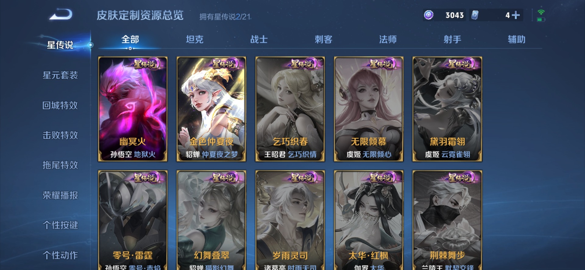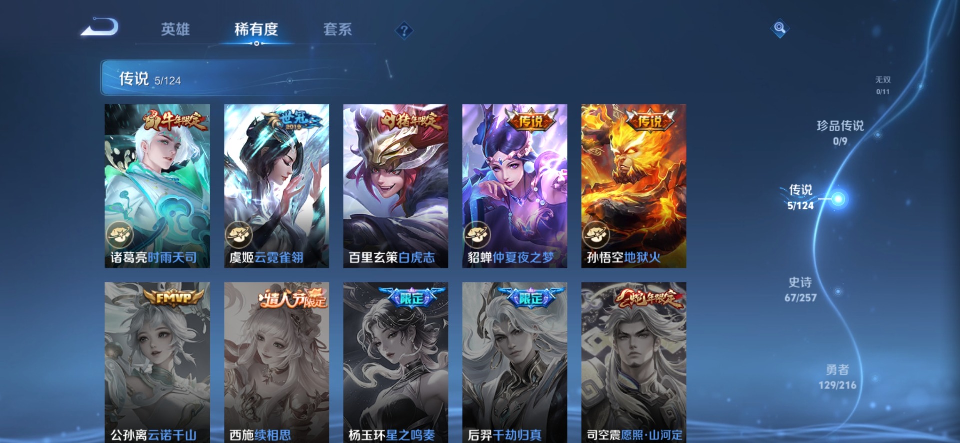 铠青龙志,伽罗天狼溯光者,干将莫邪冰霜恋舞曲,鲁班七号乒乒小将,露娜一生所爱,诸葛亮时雨天司,裴擒虎李小龙,上官婉儿梁祝,马可波罗逐梦之星,孙悟空大圣娶亲,百里玄策白虎志,韩信逐梦之影,关羽冰锋战神
