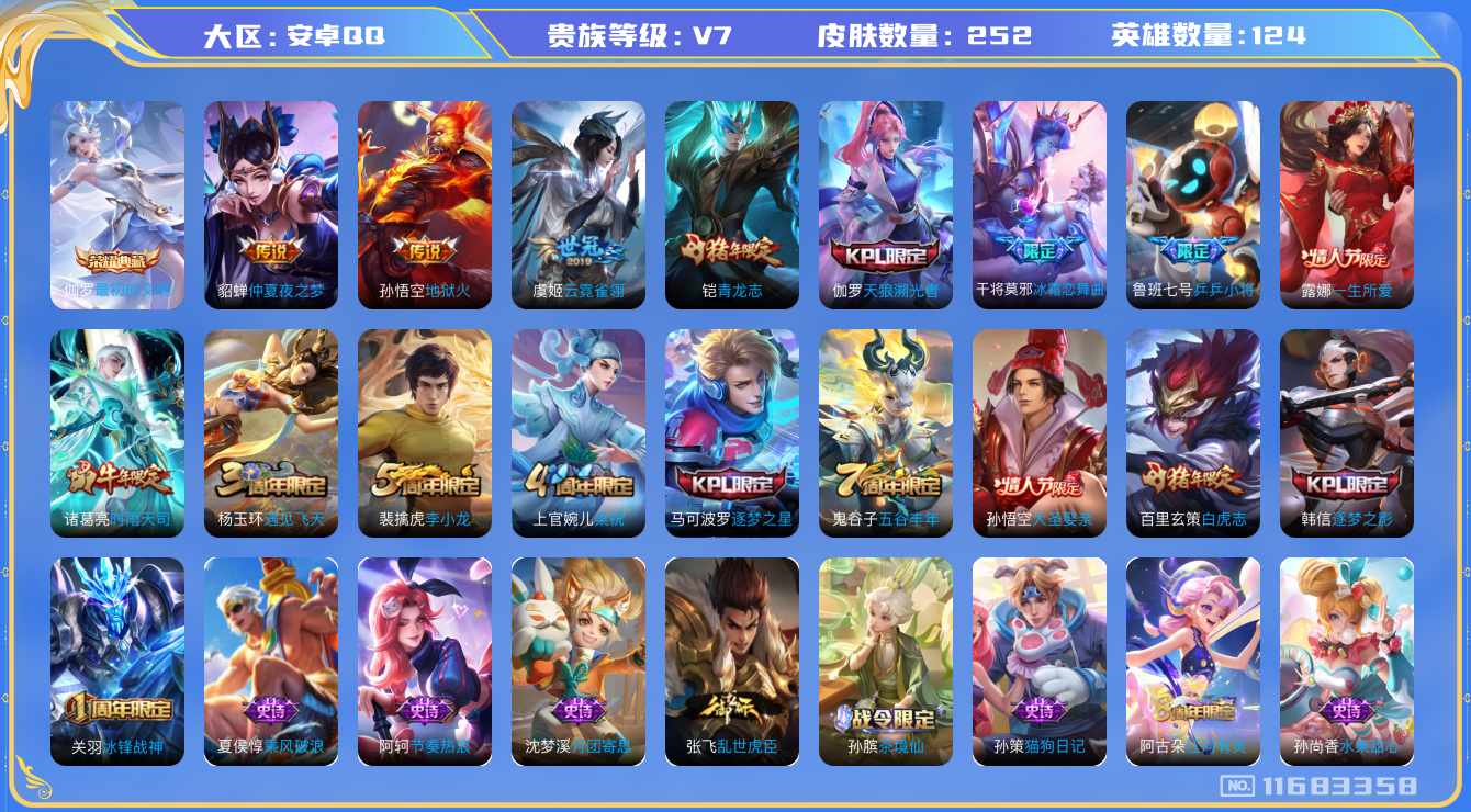 [11683358]V7 1典藏 5传说 124英雄 252皮肤 可修改实名 荣耀水晶:最初的交响(伽罗典藏) 传说皮:地狱火,仲夏夜之梦(大飞蛾),云霓雀翎 珍宝阁皮:优雅恋人,蔷薇恋人 限定皮:白虎志(电光耗子),时雨天司(水龙头),遇见飞天,五谷丰年,青龙志(铠年限),冰锋战神,梁祝,逐梦之星,天狼溯光者,李小龙,逐梦之影,一生所爱,大圣娶亲,冰霜恋舞曲,乒乒小将 史诗皮:茶境仙,蔬乡物语(鲁班七号),紫霞仙子,苍穹之光,电玩小子(小书包),特工魅影,千年之狐,江河有灵,偶像歌手,电玩·爆裂旋风,猫狗日记-孙策,乱世虎臣,节奏热浪,女仆咖啡,摇滚巨星,水果甜心,天才门将,星夜王子,心灵骇客,功夫厨神,暗隐猎兽者,鬼剑武藏,心灵战警,舞动绿茵,纤云弄巧,繁星吟游(呼啦呼啦),拒霜思,乘风破浪,逐浪之夏,月团寄思,水晶猎龙者,金属风暴,圣诞狂欢,圣诞恋歌,鹰眼统帅,魅力维加斯,无心,未来纪元-赵云
