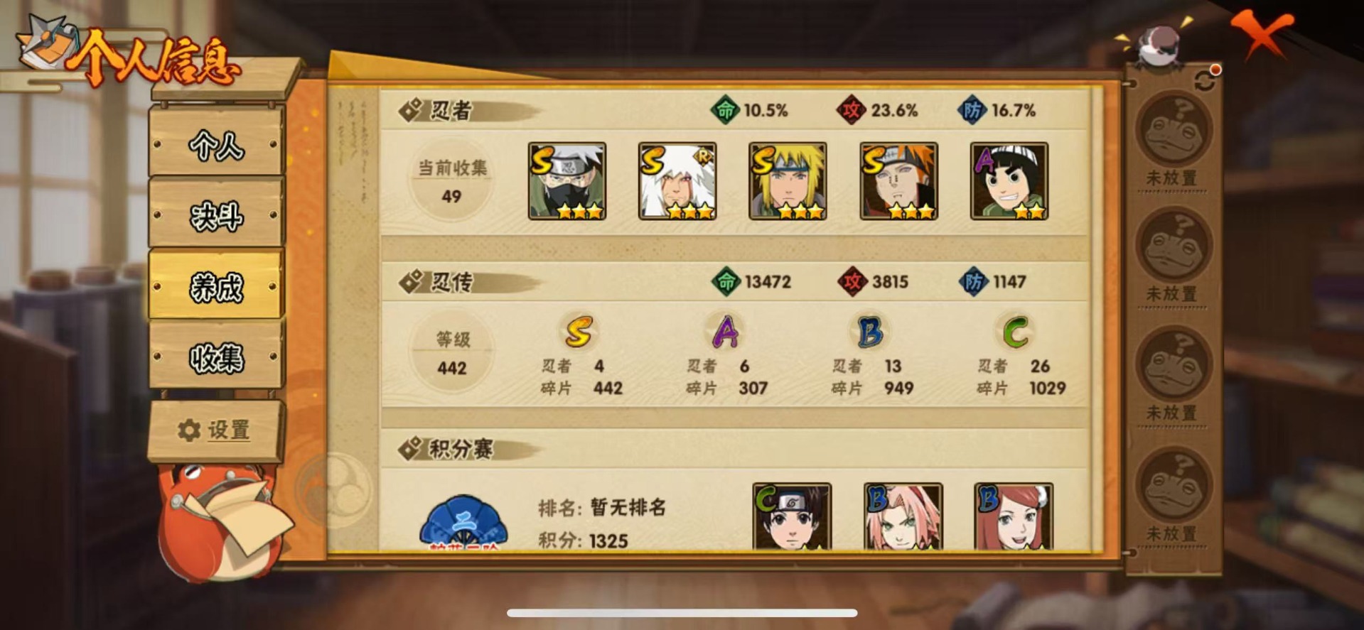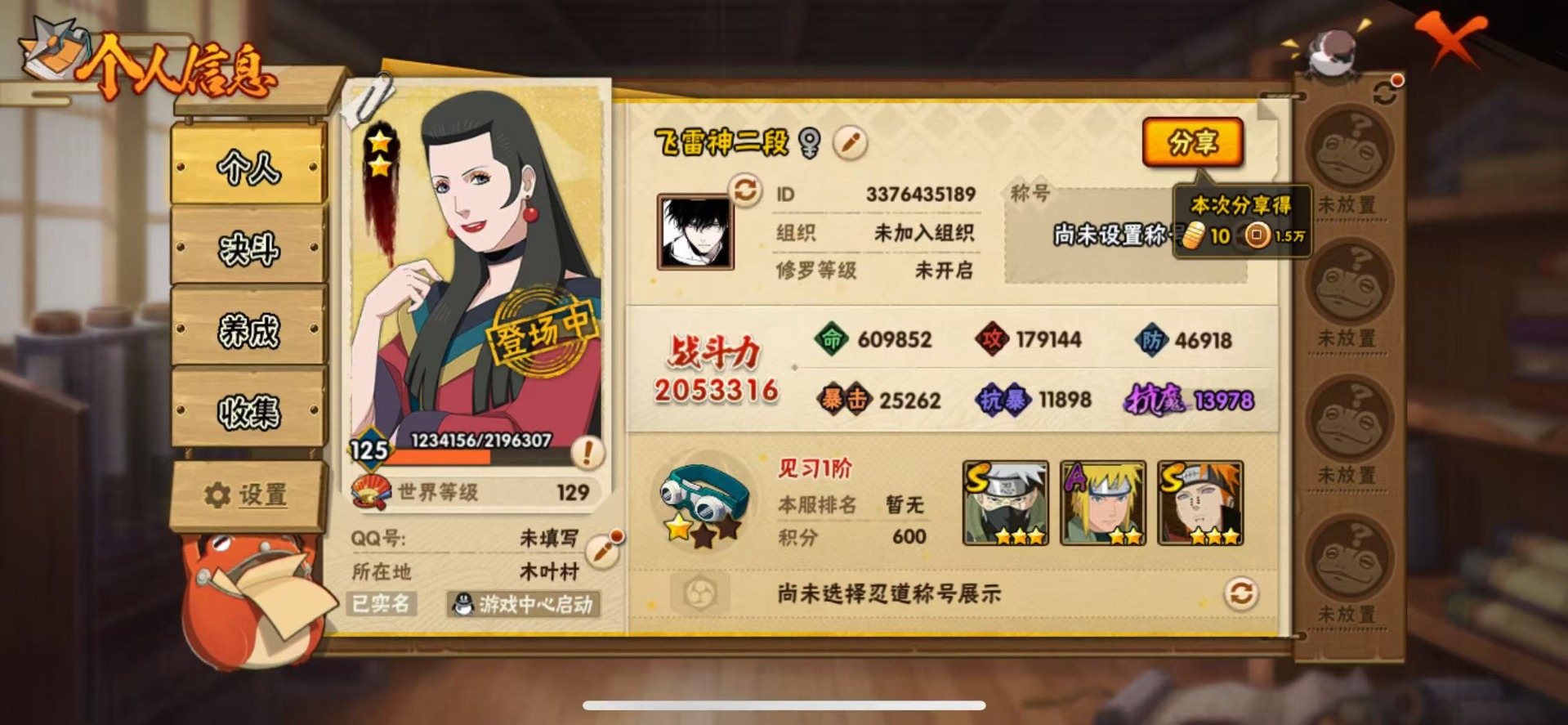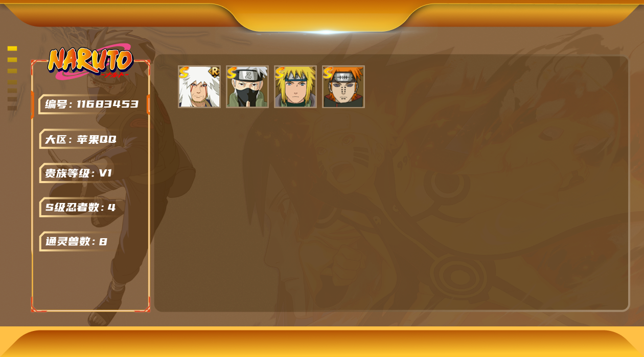 [11683453]V1 4S忍 6A忍 8通灵 205.3W战力 可二次 可修改实名 优质装备:旗木卡卡西「须佐能乎」 S级忍者:自来也 「舞之豪杰」,佩恩「天道」,波风水门