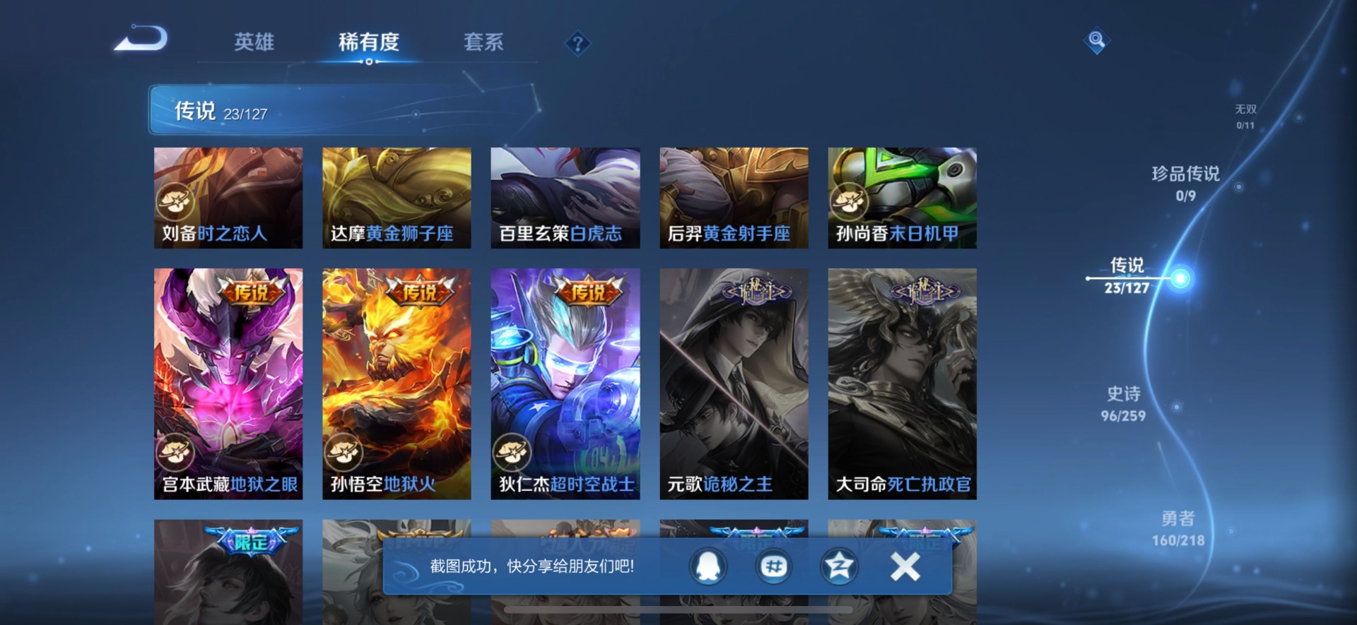 - PX_2078016-贵族等级: V8 英雄数: 84 皮肤数: 80 荣耀水晶: 星域神启 星传说: 时之愿境,金色仲夏夜 传说皮: 黄金射手座,一念神魔,仲夏夜之梦,音你心动-小乔,飞鸢探春,音你心动-周瑜,淬星耀世,花朝如约 限定皮: 寅虎·瑞焰,寅虎·赤拳,时之祈愿-云中君,时之祈愿-瑶,玉兔公主