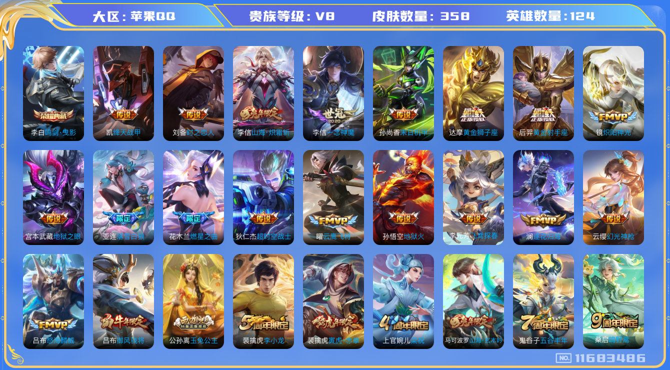 - [12091306]V8 1典藏 14传说 123英雄 233皮肤 可修改实名 优质装备:全息碎影(猴子典藏),久胜战神,末日机甲-孙尚香(绿蚂蚱),地狱火,仲夏夜之梦(大飞蛾),零号·赤焰,地狱之眼,淬星耀世,超时空战士-狄仁杰 珍宝阁皮:胡桃夹子,优雅恋人,蔷薇恋人 限定皮:愿照·九州拓(澜年限),逐霄战戟,至尊宝,凤求凰(白切鸡),凤凰于飞,寅虎·展翼(孙膑年限),时雨天司(水龙头),飞衡(韩信年限),遇见飞天,高山流水,五谷丰年,青龙志(铠年限),游园惊梦,梁祝,李小龙,逐梦之影,大圣娶亲,天魔缭乱,青春决赛季,寅虎·瑞焰(虎皮蛋子) 史诗皮:百相守梦-黄忠,紫霞仙子,苍穹之光,电玩小子(小书包),白龙吟,黄金分割率,特工魅影,千年之狐,冰冠公主,暗夜猫娘,龙骑士(小龙虾),猫狗日记-孙策,乱世虎臣,节奏热浪,修罗,女仆咖啡,水果甜心,绅士熊喵,天才门将,星夜王子,心灵骇客,功夫厨神,德古拉伯爵,暗隐猎兽者,幽灵船长,鬼剑武藏,心灵战警,舞动绿茵,地狱岩魂,拒霜思,缤纷独角兽,乘风破浪,逐浪之夏,水晶猎龙者,曙光守护者,金属风暴,原初追逐者,圣诞狂欢,圣诞恋歌,鹰眼统帅,王者之锤,魅力维加斯,未来纪元-赵云