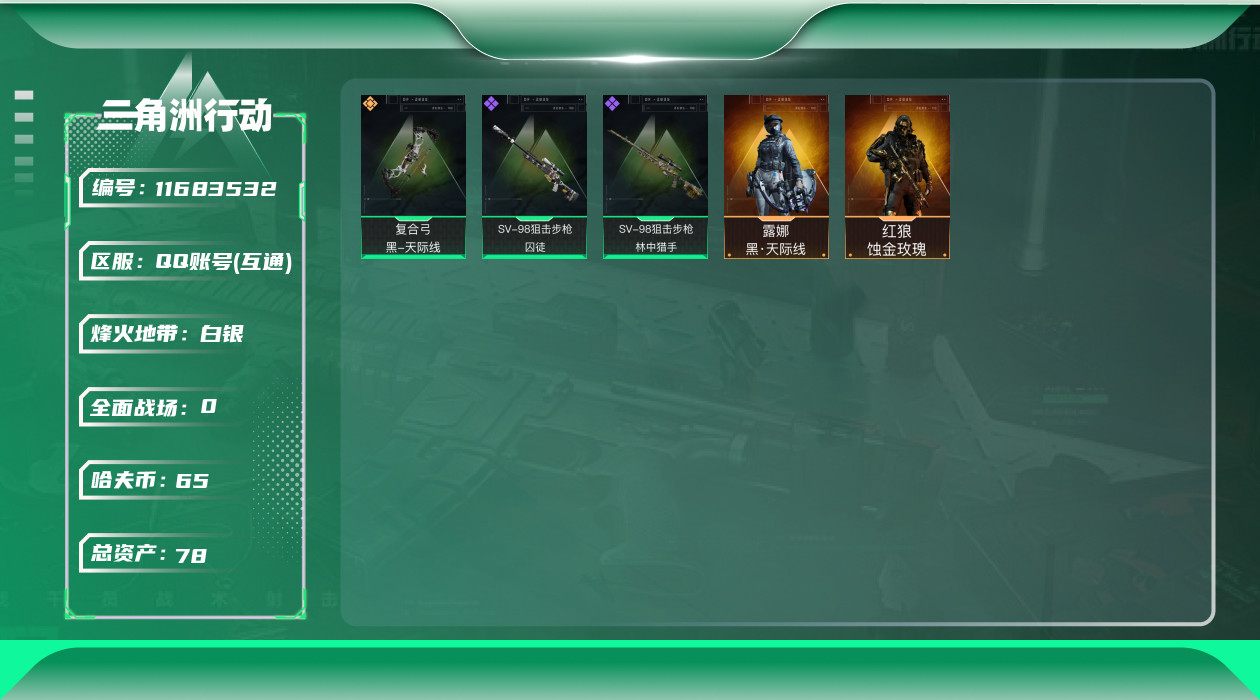 [11683532]可二次 可修改实名 实名:可修改 烽火地带段位:白银 全面战场段位:尉官 高级安全箱(2×3)9.15号到期 总资产:78.2 哈夫币:65.277 传说武器皮肤:复合弓-黑-天际线 史诗武器皮肤:SV-98狙击步枪-林中猎手,SV-98狙击步枪-囚徒 干员外观:红狼-蚀金玫瑰,露娜-黑·天际线