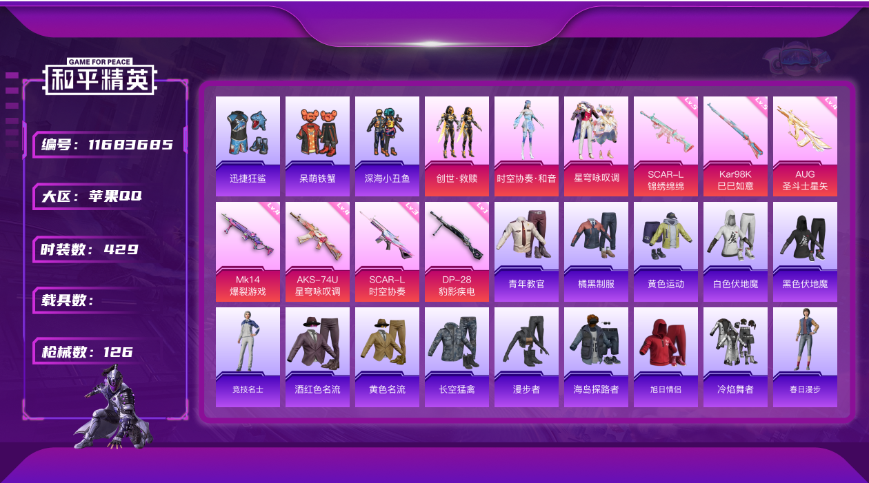 [11683685]3粉装 7特效枪 6印记 可二次 可修改实名 优质装备:SCAR-L-锦绣绵绵,时空协奏·和音,SCAR-L-时空协奏,AUG-圣斗士星矢,星穹咏叹调,AKS-74U-星穹咏叹调,Mk14-爆裂游戏,Kar98K-巳巳如意 热门装扮:创世·救赎,迅捷狂鲨,呆萌铁蟹,深海小丑鱼 稀有枪皮:DP-28-豹影疾电 五级特效枪:五级Kar98K-巳巳如意,五级SCAR-L-锦绣绵绵 四级特效枪:四级Mk14-爆裂游戏,四级AUG-圣斗士星矢,四级AKS-74U-星穹咏叹调 三级特效枪:三级SCAR-L-时空协奏 一级特效枪:一级DP-28-豹影疾电 紫色装扮:SS22特训,娇憨猪猪,萌趣咩咩,SS21特训,引力深渊,SS31特训套装,虚空漩涡,冰川特警,冷焰舞者,霓虹热舞,旭日情侣,SS30特训套装,云朵鹅,雪绒豹,SS33特训套装,顶瓜瓜,吉莉礼服,酒红色名流,长空猛禽,青年教官,缤纷果语,耀眼新星,蓝彩潮人,飞行日记,魅力单车,鹤鸣,麻辣教官,黄色名流,黄色运动,黑色伏地魔,龙的传人,龟仙人,冰河战士,龙魂突击队,蝶变,沙漠毒蛇,极地朋克,橘黑制服,暗金炫舞,海岛探路者,深蓝色名流,清新柠檬,绮丽涂鸦,白色伏地魔,破晓战魂,破蛋小黄鸡,牛气冲天,热血青春,热血骑手,小熊娃娃,雏菊兔兔,萝兰蝴蝶,SS29特训,星途旅人,SS28特训,异域银装,鱼渊荷华,燕燕于飞,镭金极速,巳巳如意,森林游猎者,青团波波,糖糖葫芦,棉花软糖,竞技名士,摩登魅猫,街头风暴,惊鸿侠骨,SS24特训(SS24特训套装),SS25特训,绝对偶像,锦衣飞扬,焰鹰斗篷,幻羽潜行,幽夜迷踪,SS27特训,童真绒兔,萌趣绒叽,Alan Walker,小丑鱼,SS26特训,智谋强哥,大橘大利,星渊小夜曲,星影赞美诗,小鸟芋圆,春日漫步,粉恋花,蓝冰羽,紫幽梦,SS32特训服(SS32特训套装),荧光绘影,青玉碎影,绯格组合,闪电轻猫,漫步者,冰冻风暴,弄潮海豚,光之冒险,半糖蓝莓 优质战备:霓虹漫游飞行器,精灵梦叶罗丽降落伞,星途旅人降落伞,千金淑猫降落伞,繁龙极客飞行器,幻彩电音降落伞,幻影飞狐降落伞,旋转彩虹降落伞,炫光之旅降落伞