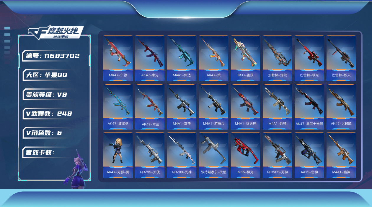 [11683702]可二次 可修改实名 V8 10王者武器 248英雄武器 6英雄角色 410万化 枪圣SS 英雄武器:MK47-仁德,AK47-奉先,M4A1-仲达,AK47-策,KSG-孟获,加特林-炼狱,巴雷特-极光,巴雷特-毁灭,AK47-波塞冬,AK47-木兰,M4A1-雷神,M4A1-游骑兵,M4A1-堕天神,M4A1-死神,AK47-黑武士觉醒,AK47-火麒麟,AK47-无影-葵,QBZ95-天使,QBZ03-死神,双持斯泰尔-天使,MK5-极光,QCW05-死神,AA12-雷神,M4A1-猎神,M4A1-夏清觉醒,M4A1-千变,巴雷特-安琪拉,AK47-黑鲨,AK47-血武士,AK47-华夏传说,M4A1-破空冰刃,M4A1-运输船,M4A1-心动次元觉醒,M4A1-赛博雷神,M4A1-Rush-夜袭,M4A1-海骑士,AK47-沙漠郡主-超觉,AK47-猩红传说,AK47-心动次元,AK47-幸运日觉醒,AK47-沙漠郡主-二觉,AK47-幸运日,SCAR-幽暗骑士,SCAR-探星者,M200-心动次元觉醒,暗杀神,AWM-天龙,SKS-美杜莎,AK12-天启,剑齿虎-炫彩,AN94-四凶觉醒,AN94-超新星,9A91-天神,M4A1-神工天巧,SCAR-印刷术,SCAR-守护者觉醒,加特林-堡垒,RPK-赤炎盘龙,MK47-鼓龙,AK47-破空冰刃,M14EBR-拂影,加特林-蟒蛇,寒霜烈龙,CZS2-血月,加特林-堡垒觉醒,KSG-火力竞放,KSG-极光,毁灭征服者-超越Max,地狱烈樱·一觉,M4A1-太白诗仙,USP-仁德,9A91-魔蜥觉醒,尼泊尔-星象,穷奇铁扇,丈八蛇矛,雌雄双股剑,虎贲钩镰刀,墨刃-幻神,左轮-黑武士觉醒,左轮-竞界荣光,沙鹰-修罗,沙鹰-波塞冬,沙鹰-冰锋觉醒,双持柯尔特-极光,USP-太白诗仙,三叉戟-波塞冬,擎天觉醒,马来剑-毁灭,斩魔剑-天使,尼泊尔-铜头铁臂,尼泊尔-冰锋觉醒,蝴蝶刀-极光,蟒蛇-火力竞放,USP-神罚,沙鹰-飞电,沙鹰-天神,丛林匕首-火力竞放,麒麟刺,星芒,龙鳞-觉醒,耀金雷刃,双刃-昼伏夜影觉醒,太白诗仙扇,高爆手雷-雷霆,黑骑士手雷,黑武士闪光弹,火麒麟闪光弹,闪光弹-游骑兵,雷神手雷,雷神烟雾弹