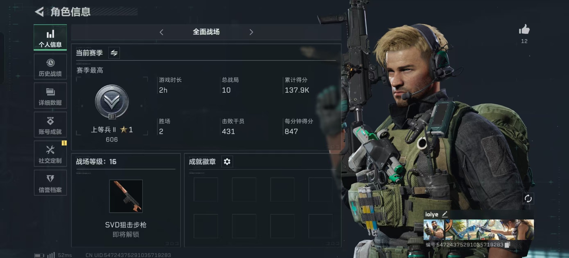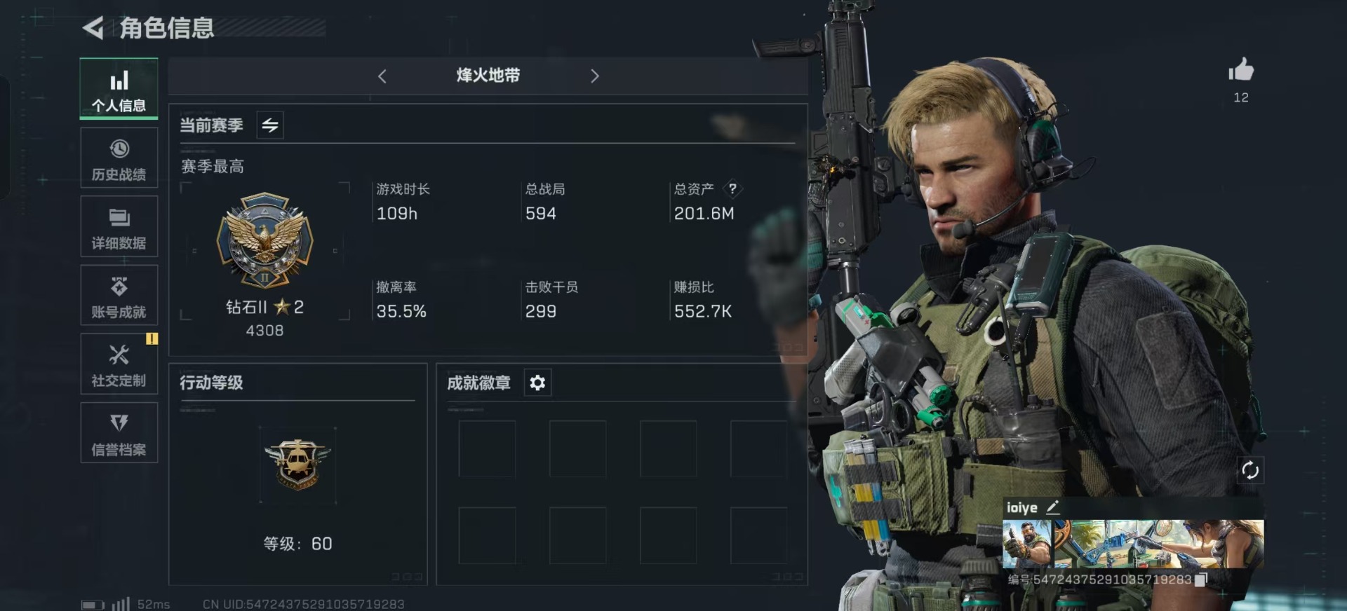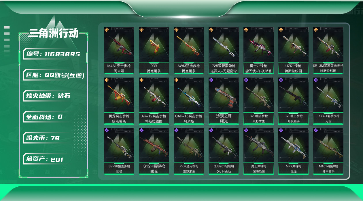 [11683895]总资产:201.6M 10传说枪械 哈夫币:79.632K 高级安全箱(9.16到期) 可二次 可修改实名 烽火地带段位:钻石 全面战场段位:上等兵 传说武器皮肤:UZI冲锋枪-特斯拉线圈,AWM狙击步枪-捞点薯条,腾龙突击步枪-捞点薯条,93R-捞点薯条,AK-12突击步枪-特斯拉线圈,SR-3M紧凑突击步枪-特斯拉线圈,勇士冲锋枪-能天使-午夜邮差,725双管霰弹枪-送葬人-无题密令,M4A1突击步枪-阿米娅,CAR-15突击步枪-阿米娅 史诗武器皮肤:AUG突击步枪-蝮蛇,QJB201轻机枪-Old Habits,M1014霰弹枪-林中猎手,MP5冲锋枪-深海恐惧,勇士冲锋枪-深海恐惧,AKM突击步枪-林中猎手,PTR-32突击步枪-Old Habits,M16A4突击步枪-竞赛选手,PTR-32突击步枪-英雄,AS Val突击步枪-典狱官,SV-98狙击步枪-囚徒,SVD狙击步枪-暗夜猎手,腾龙突击步枪-无垢,MP7冲锋枪-无垢,PSG-1射手步枪-无垢,SVD狙击步枪-荒野求生,SR-3M紧凑突击步枪-荒野求生,PKM通用机枪-荒野求生,沙漠之鹰-曙光,S12K霰弹枪-曙光,P90冲锋枪-紧急戒备