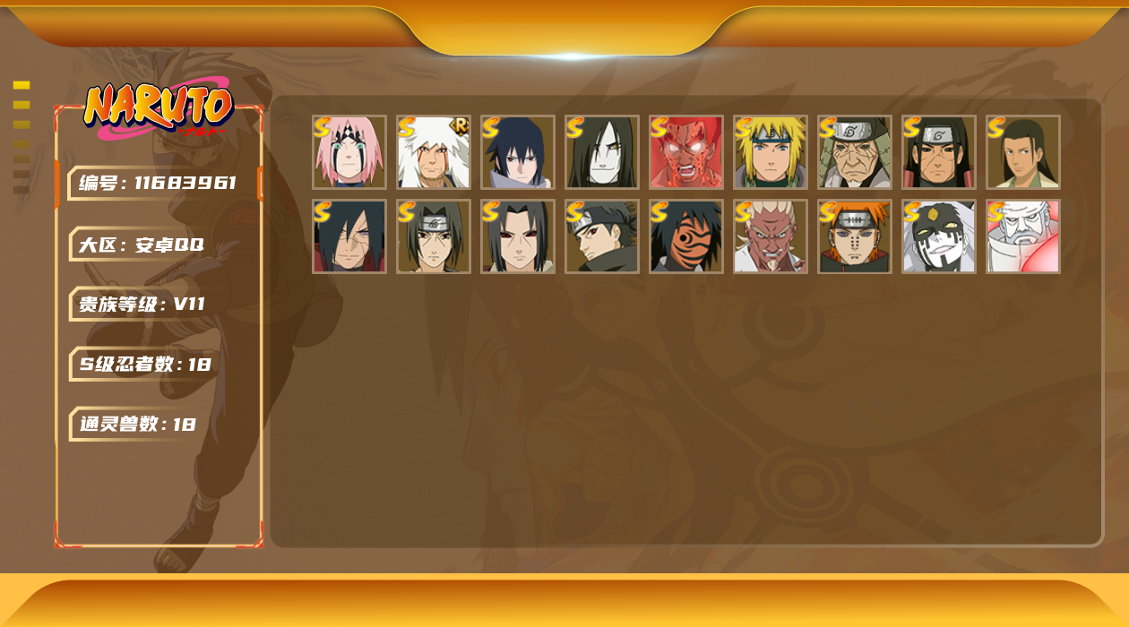 [11683961]V11 18S忍 32A忍 18通灵 686.9W战力 可二次 可修改实名 优质装备:千手柱间「秽土转生」,宇智波鼬「秽土转生」,猿飞日斩「秽土转生」,迈特凯「死门」,大筒木金式「博人传」,春野樱 「忍界大战」,神秘面具男 「红夜之刃」,宇智波佐助「永恒万花筒」,千手柱间·木叶创立,宇智波斑「秽土转生·解」,大筒木桃式,艾「忍界大战」,宇智波止水「须佐能乎」 S级忍者:自来也 「舞之豪杰」,宇智波鼬 「须佐能乎」,佩恩「天道」,波风水门,大蛇丸