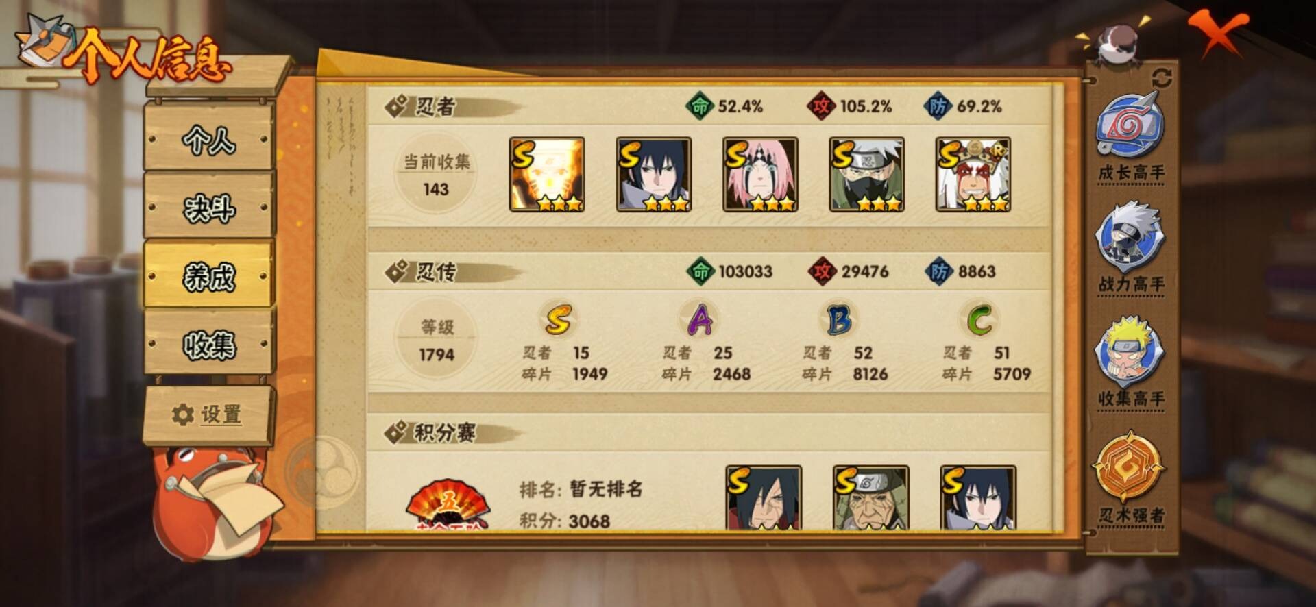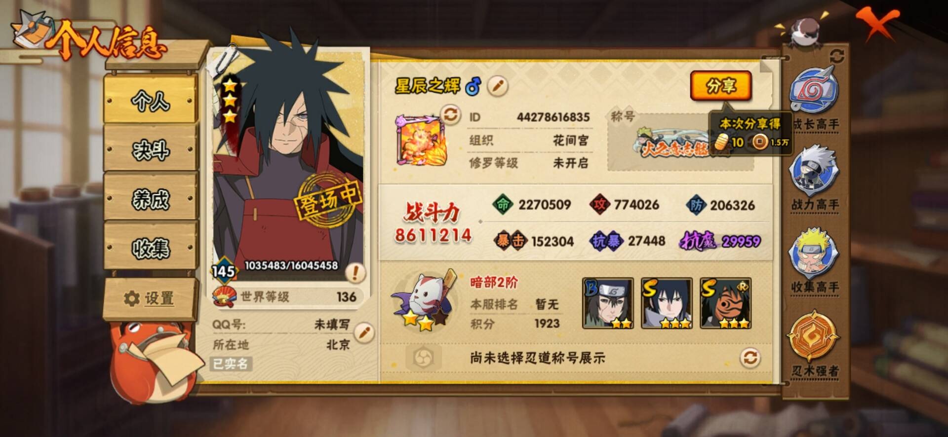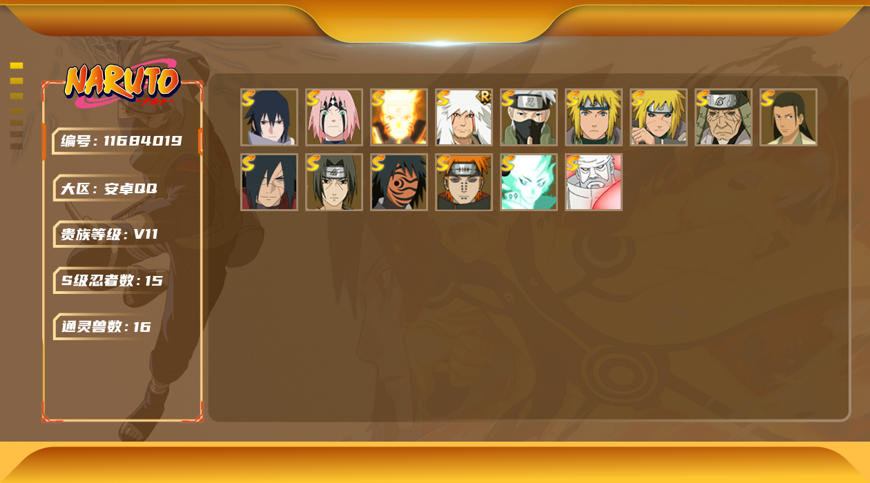 [11684019]V11 15S忍 27A忍 16通灵 861.1W战力 可二次 可修改实名 优质装备:波风水门「秽土转生」,猿飞日斩「秽土转生」,漩涡鸣人 「九喇嘛连结」,大筒木金式「博人传」,春野樱 「忍界大战」,神秘面具男 「红夜之刃」,宇智波佐助「永恒万花筒」,千手柱间·木叶创立,宇智波斑「秽土转生·解」,旗木卡卡西「须佐能乎」,大筒木舍人 「最终章」 S级忍者:自来也 「舞之豪杰」,宇智波鼬 「须佐能乎」,佩恩「天道」,波风水门