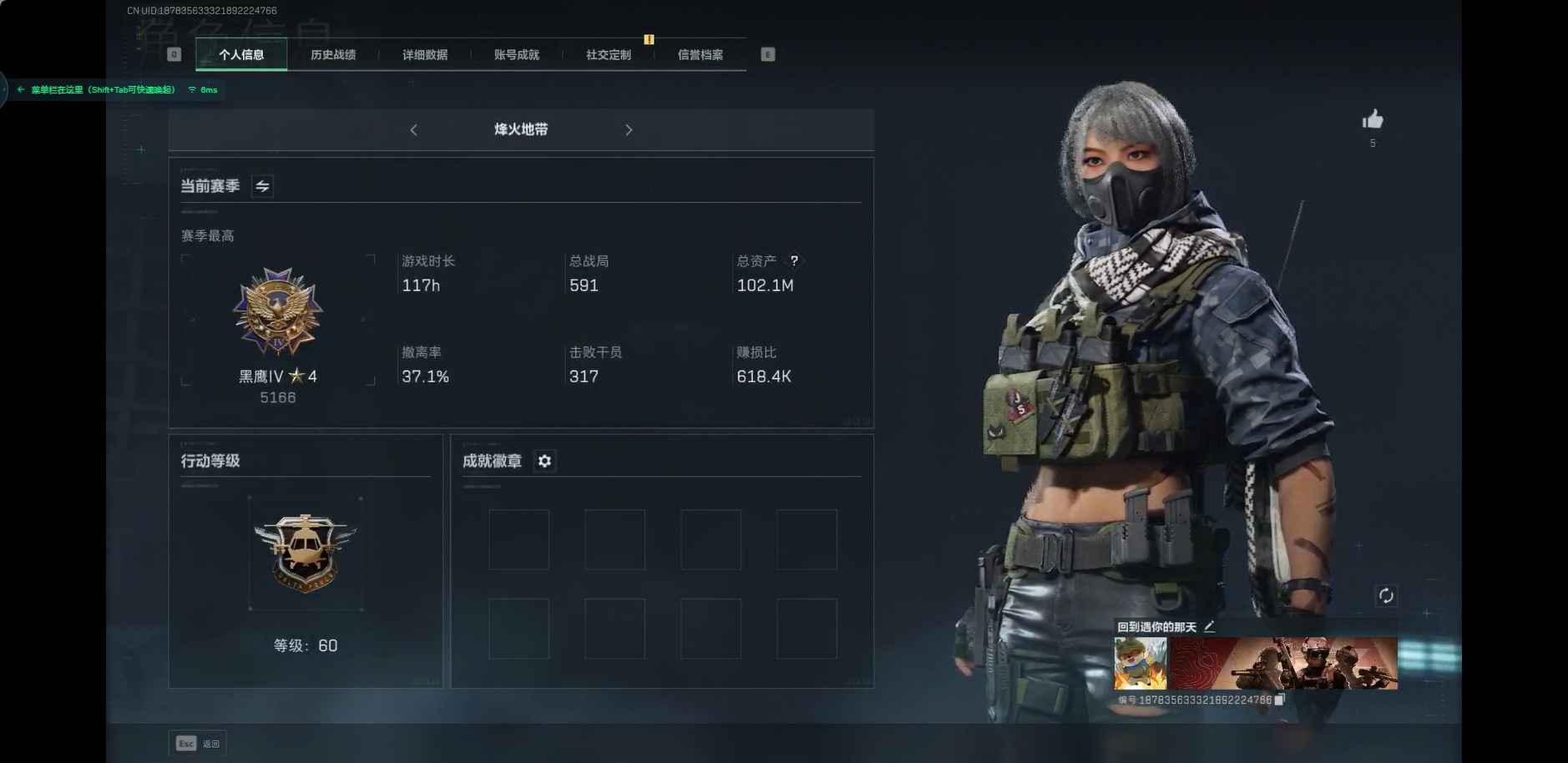 [11684160]总资产:102.1M 11传说枪械 哈夫币:61.758K 进阶安全箱(2×2)9.15号到期 可二次 可修改实名 烽火地带段位:黑鹰 全面战场段位:无段位 传说武器皮肤:SR-25射手步枪-水墨云图,M16A4突击步枪-狩猎时刻,M4A1突击步枪-阿米娅,CAR-15突击步枪-阿米娅,复合弓-黑-天际线,Vector冲锋枪-狩猎时刻,G3战斗步枪-狩猎时刻,AWM狙击步枪-捞点薯条,腾龙突击步枪-捞点薯条,93R-捞点薯条,勇士冲锋枪-能天使-午夜邮差 史诗武器皮肤:M16A4突击步枪-竞赛选手,MP5冲锋枪-深海恐惧,勇士冲锋枪-深海恐惧,SG552突击步枪-深海恐惧,AKM突击步枪-林中猎手,M1014霰弹枪-林中猎手,SV-98狙击步枪-林中猎手,PTR-32突击步枪-英雄,M250通用机枪-囚徒,SCAR-H战斗步枪-囚徒,QBZ95-1突击步枪-曙光,Vector冲锋枪-阿萨拉文明,SVD狙击步枪-阿萨拉工艺
