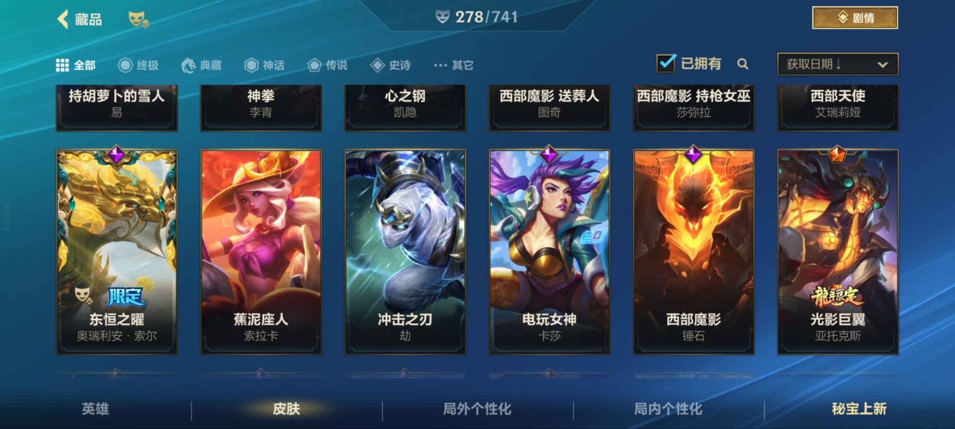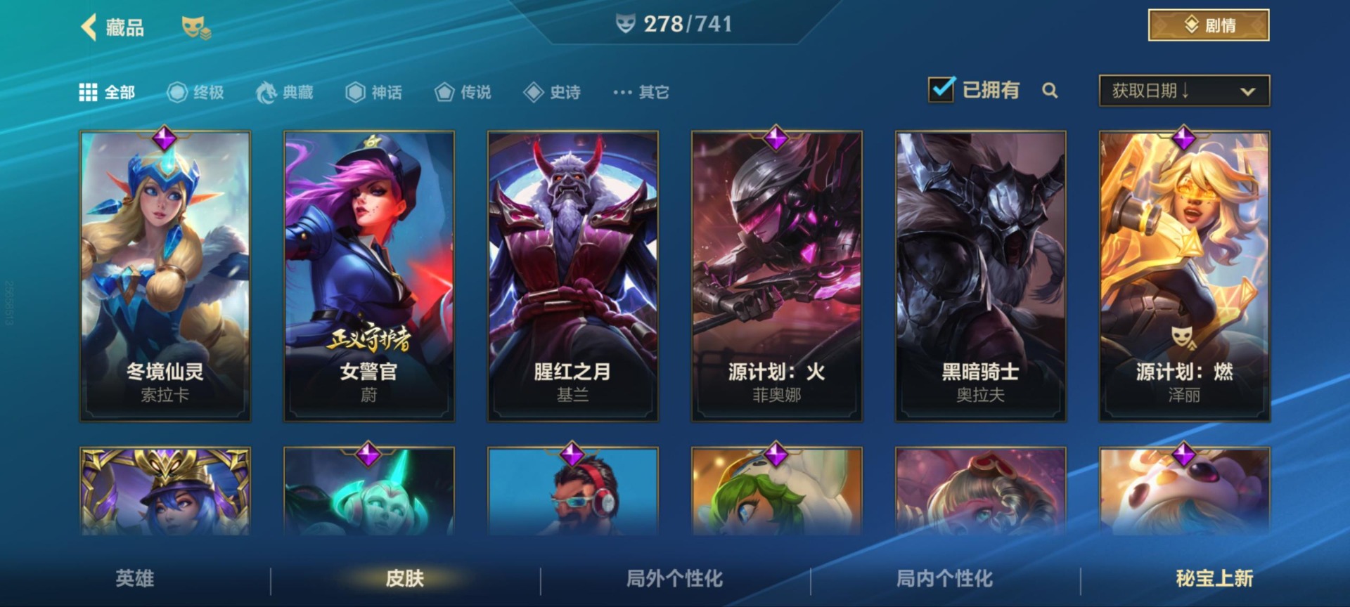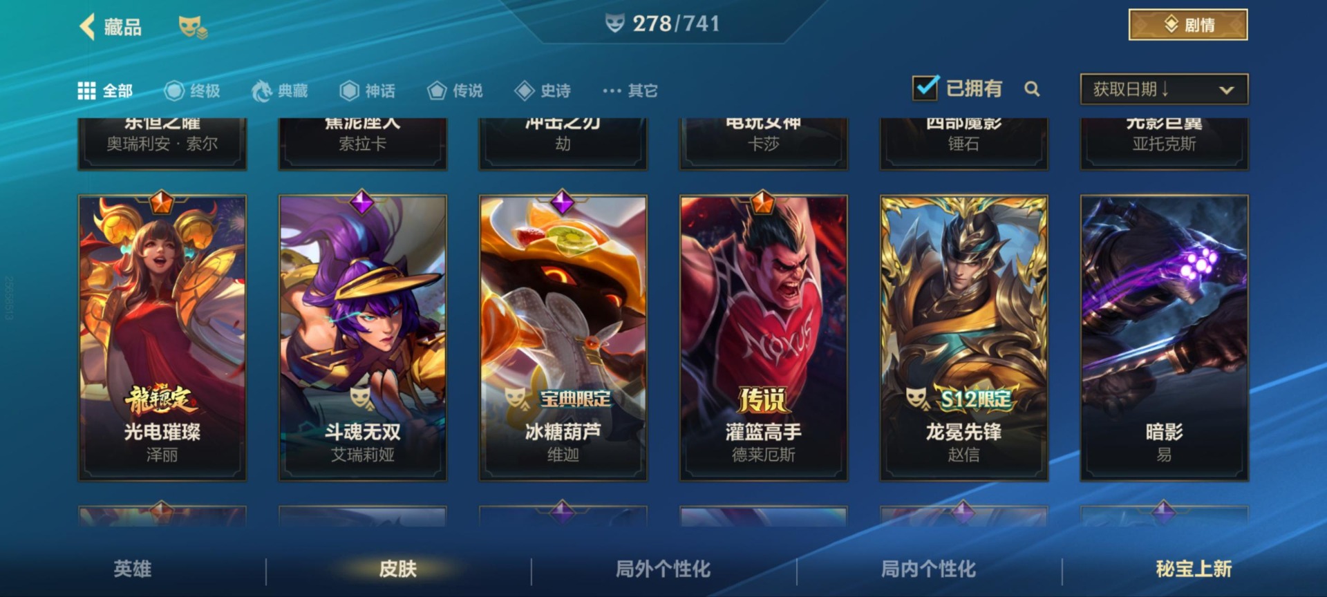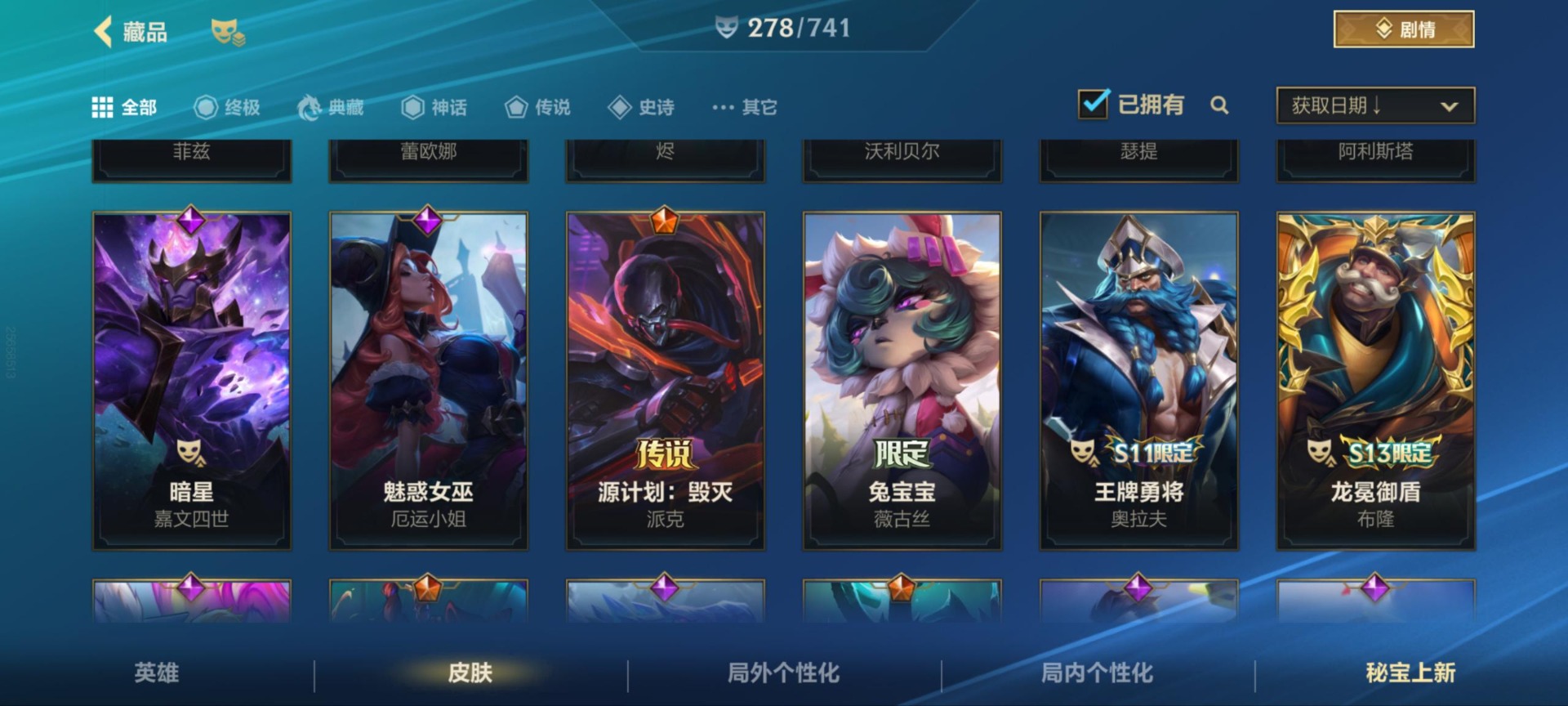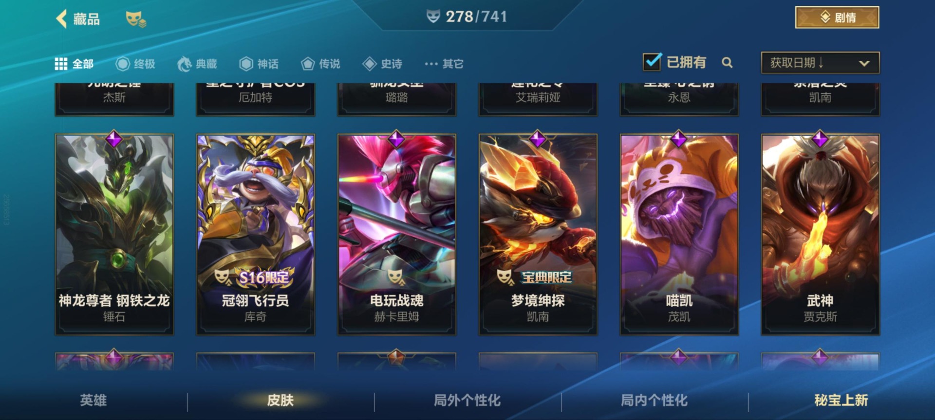 - PX_2113115-安卓QQ 171皮 贵族7级 1典藏 1珍品传说 1无双 7传说 59史诗【荣耀典藏】全息碎影【珍品传说】怪盗基德【无双限定】花合斗【传说皮肤】武圣,愿照·千秋盛,地狱火,山海·苍雷引,一念神魔,白虎志,琥珀纪元【史诗皮肤】石田雨龙,梁祝,纤云弄巧,心灵战警,无心,云间偶戏,暗隐猎兽者,天才门将,绅士熊喵,鸭鸭历险记,德古拉伯爵,如梦令,圣诞狂欢,龙骑士,猫狗日记,东方月初,