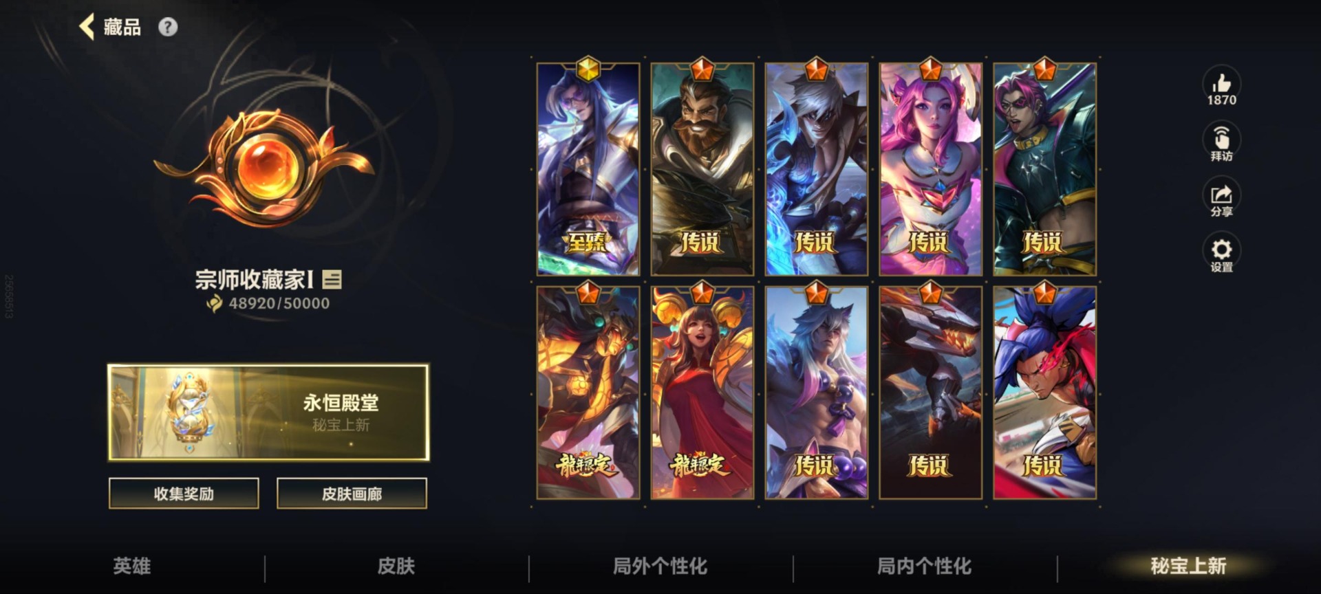 - [11884528]V5 4传说 115英雄 116皮肤 可修改实名 优质装备:黄金狮子座,黄金射手座,时之恋人-刘备(电焊工) 珍宝阁皮:胡桃夹子 限定皮:鸣野蒿,神威(电光马子),飞衡(韩信年限),梁祝,龙胆,烈魂,李小龙 史诗皮:特工魅影,千年之狐,江河有灵,冰冠公主,暗夜猫娘,末日机甲-吕布,修罗,水果甜心,天才门将,德古拉伯爵,暗隐猎兽者,鬼剑武藏,纤云弄巧,水晶猎龙者,圣诞狂欢,鹰眼统帅,未来纪元-赵云