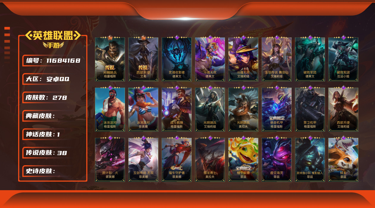 [11684168]可二次 可修改实名 1神话 38传说 141史诗 278皮肤 129英雄 铂金 皮肤:德莱文-灵魂收割者,德莱文-金牌主播,德莱文-斗魂无双,德莱文-破败军团,德莱文-绯金战斧,德莱文-德莱德莱,格雷福斯-泳池派对,格雷福斯-战斗教授,格雷福斯-光明哨兵,格雷福斯-绝命机甲,格雷福斯-末路教父,格雷福斯-禁卫机甲,艾瑞莉娅-莲花之令,艾瑞莉娅-光明哨兵,艾瑞莉娅-西部天使,艾瑞莉娅-斗魂无双,艾瑞莉娅-玉剑传说 舞剑仙,艾瑞莉娅-冰霜之刃,菲奥娜-源计划:火,菲奥娜-玉剑传说 无双,菲奥娜-泳池派对,菲奥娜-绯金丽刃,菲奥娜-福牛守护者,菲奥娜-皇家守卫,奥拉夫-黑暗骑士,奥拉夫-猎龙勇士,奥拉夫-光明哨兵,奥拉夫-五连摇滚鼓手,奥拉夫-王牌勇将,奥拉夫-铁哥们儿,艾希-王牌司令,艾希-西部天使,艾希-极地女神,艾希-女皇,艾希-黑暗骑士,菲兹-柚子软糖,菲兹-兔宝宝,菲兹-虚空海灵,菲兹-欧米伽小队 鬼影蛙人,菲兹-绒毛,厄运小姐-女帝,厄运小姐-魅惑女巫,厄运小姐-破败军团,厄运小姐-星之守护者,厄运小姐-西部牛仔,烬-斗魂觉醒