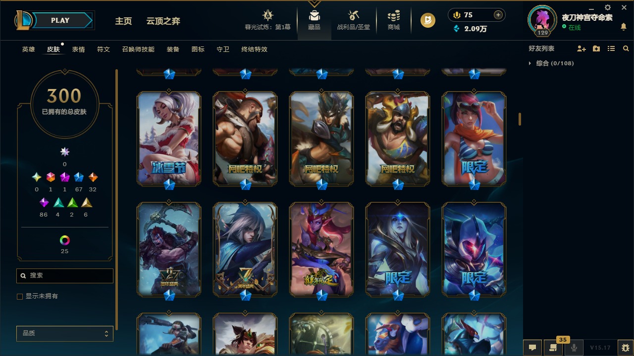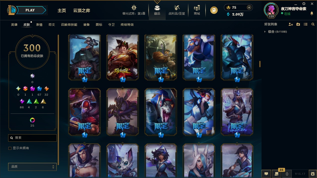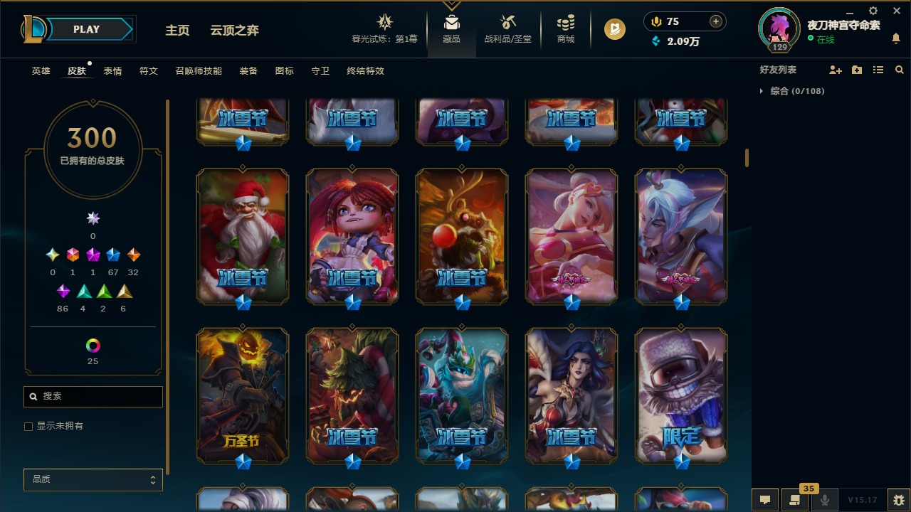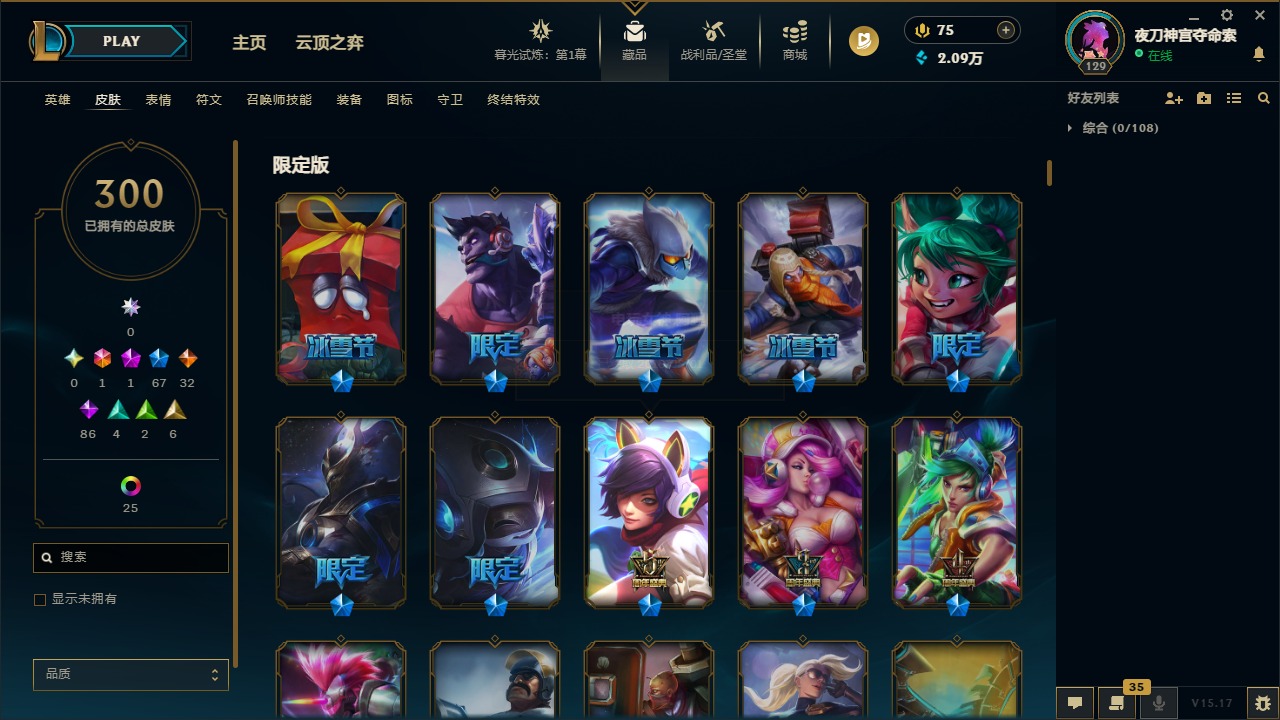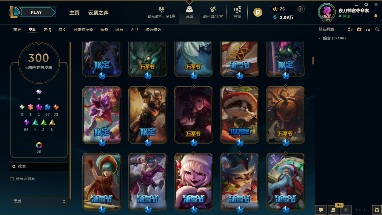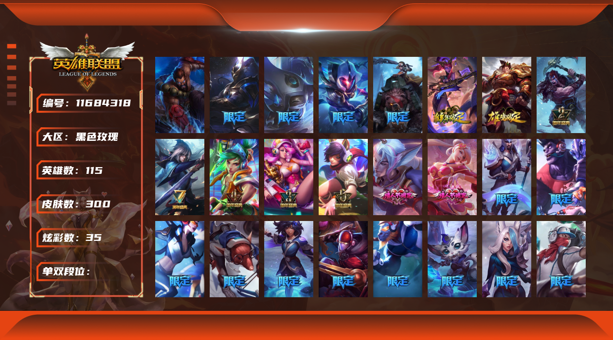 [11684318]1终极 1神话 67限定 32传说 86史诗 300皮肤 35炫彩 115英雄 可二次 可修改实名 优质装备:穿星魔锋,斩星魔剑,源代码 乐芙兰,防爆天使 凯尔,巧克力工坊 波比,电玩战魂 人马,防爆士兵 炼金,防爆士兵 格雷福斯,钢铁之翼 凤凰,冠军之血 希瓦娜,惊悚派对 阿木木,惊悚派对 费德提克,警用试作体K-9 内瑟斯,密林猎手 提莫,野兽猎人 德莱文,野兽猎人 瑟庄妮,野兽猎人 泰达米尔,御魔星矢 寒冰,灵魂守卫,霸天巨兽·雪崩 墨菲特,玉剑传说 无影 竞星,玉剑传说 无影 莫问,净雪之月 莫甘娜 冬虹,魔女 阿卡丽 虚荣 限定:战熊骑士,创星之灵 璐璐 情人节限定:甜心之翎 洛,甜心宝贝 娑娜 冠军限定系列:S1FNC 酒桶,S2 暗杀星 蒙多,S3 SKT T1 劫,S4 SSW 图奇,S4 SSW 炼金,S5 SKT T1 雷克顿,S5 SKT T1 阿利斯塔,S5 SKT T1 阿兹尔,S5 SKT T1 蜘蛛,S6 SKT T1 烬,S7 SSG 嘉文四世,S7 SSG 洛,S7 SSG 纳尔,S7 SSG 塔利亚,S7 SSG 霞,S7 SSG 伊泽瑞尔 冰雪节限定:“主人不要我了” 阿木木,冰雪节 马尔扎哈,冰雪节 炼金,胡桃夹子 小丑,平安夜女神 娑娜,魄罗骑士 瑟庄妮,圣诞开心鬼 提莫,圣诞精灵 崔丝塔娜,圣诞狂欢 时光,圣诞老人 酒桶,圣诞玩偶 波比,圣诞驯鹿 克格莫,冰雪节 茂凯,邪恶圣诞老人 维迦,幸福女神 乐芙兰,雪球也能爆炸 吉格斯,雪装 奈德丽 泳池派对:泳池派对 吉格斯,泳池派对 菲奥娜 万圣节限定:鬼影森森 茂凯,鬼影重重 魔腾,魅惑女巫 莫甘娜,南瓜头 费德提克,无头骑士 人马 年限:猴年 凯特琳,鸡年 盖伦 周年:2周年 德莱厄斯,3周年 厄运小姐,4周年 锐雯,5周年 阿狸,7周年 泰隆
