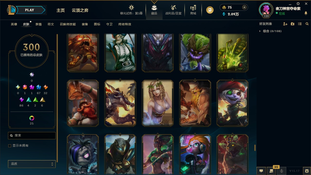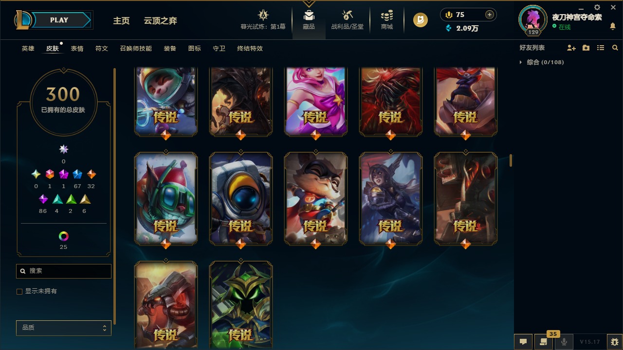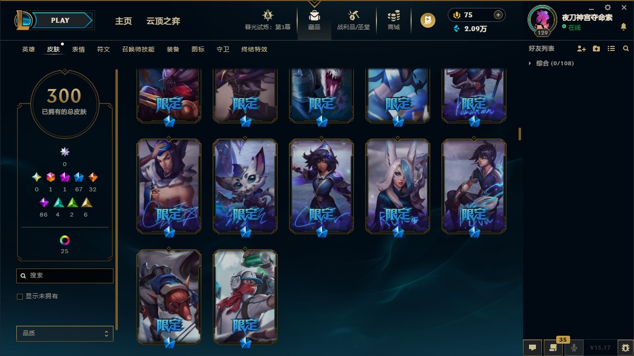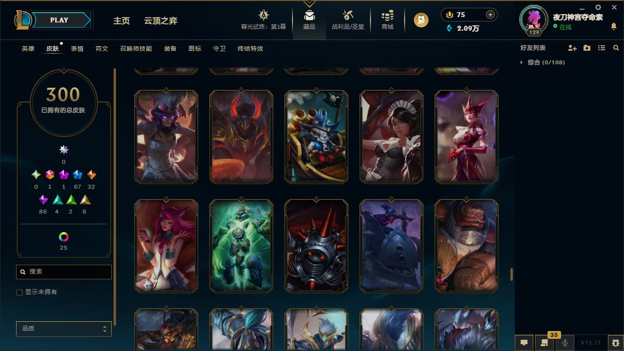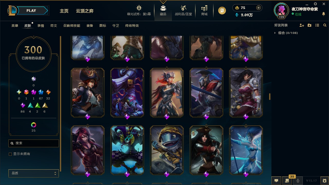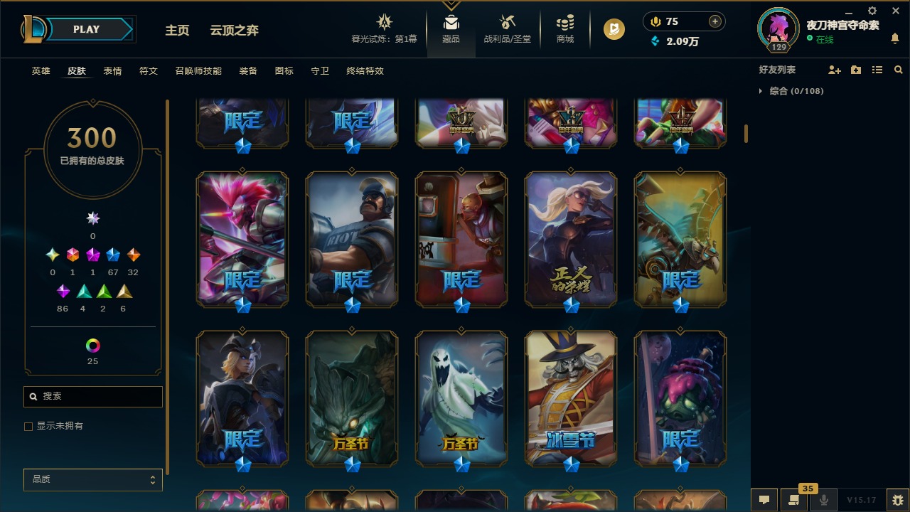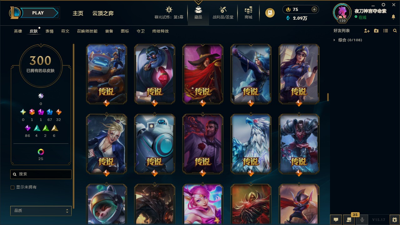 [11684318]1终极 1神话 67限定 32传说 86史诗 300皮肤 35炫彩 115英雄 可二次 可修改实名 优质装备:穿星魔锋,斩星魔剑,源代码 乐芙兰,防爆天使 凯尔,巧克力工坊 波比,电玩战魂 人马,防爆士兵 炼金,防爆士兵 格雷福斯,钢铁之翼 凤凰,冠军之血 希瓦娜,惊悚派对 阿木木,惊悚派对 费德提克,警用试作体K-9 内瑟斯,密林猎手 提莫,野兽猎人 德莱文,野兽猎人 瑟庄妮,野兽猎人 泰达米尔,御魔星矢 寒冰,灵魂守卫,霸天巨兽·雪崩 墨菲特,玉剑传说 无影 竞星,玉剑传说 无影 莫问,净雪之月 莫甘娜 冬虹,魔女 阿卡丽 虚荣 限定:战熊骑士,创星之灵 璐璐 情人节限定:甜心之翎 洛,甜心宝贝 娑娜 冠军限定系列:S1FNC 酒桶,S2 暗杀星 蒙多,S3 SKT T1 劫,S4 SSW 图奇,S4 SSW 炼金,S5 SKT T1 雷克顿,S5 SKT T1 阿利斯塔,S5 SKT T1 阿兹尔,S5 SKT T1 蜘蛛,S6 SKT T1 烬,S7 SSG 嘉文四世,S7 SSG 洛,S7 SSG 纳尔,S7 SSG 塔利亚,S7 SSG 霞,S7 SSG 伊泽瑞尔 冰雪节限定:“主人不要我了” 阿木木,冰雪节 马尔扎哈,冰雪节 炼金,胡桃夹子 小丑,平安夜女神 娑娜,魄罗骑士 瑟庄妮,圣诞开心鬼 提莫,圣诞精灵 崔丝塔娜,圣诞狂欢 时光,圣诞老人 酒桶,圣诞玩偶 波比,圣诞驯鹿 克格莫,冰雪节 茂凯,邪恶圣诞老人 维迦,幸福女神 乐芙兰,雪球也能爆炸 吉格斯,雪装 奈德丽 泳池派对:泳池派对 吉格斯,泳池派对 菲奥娜 万圣节限定:鬼影森森 茂凯,鬼影重重 魔腾,魅惑女巫 莫甘娜,南瓜头 费德提克,无头骑士 人马 年限:猴年 凯特琳,鸡年 盖伦 周年:2周年 德莱厄斯,3周年 厄运小姐,4周年 锐雯,5周年 阿狸,7周年 泰隆