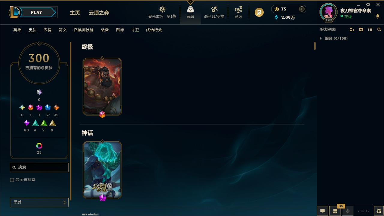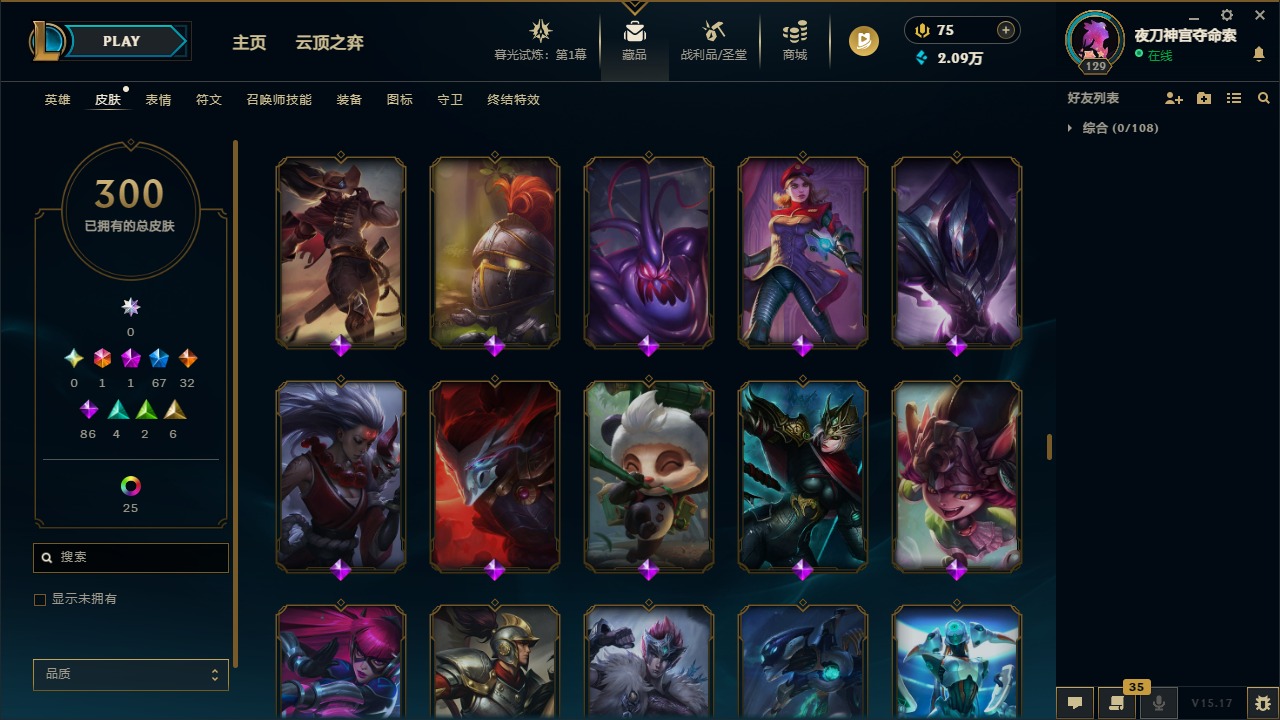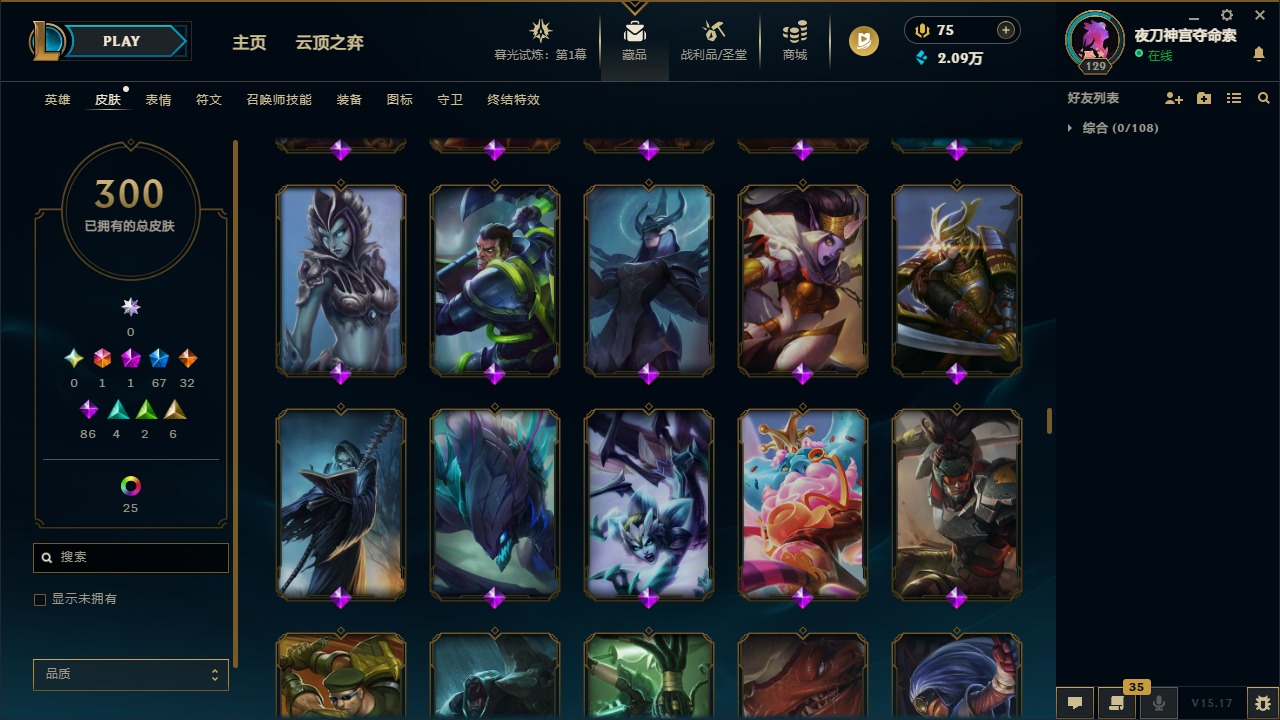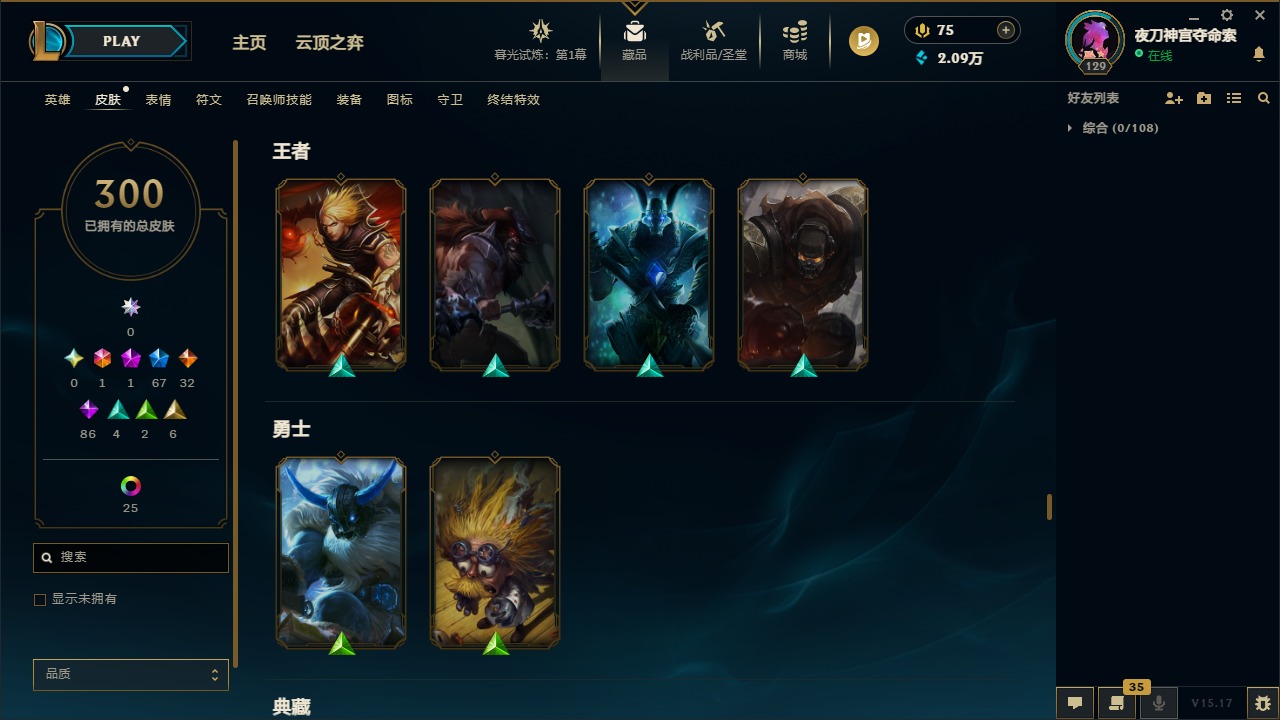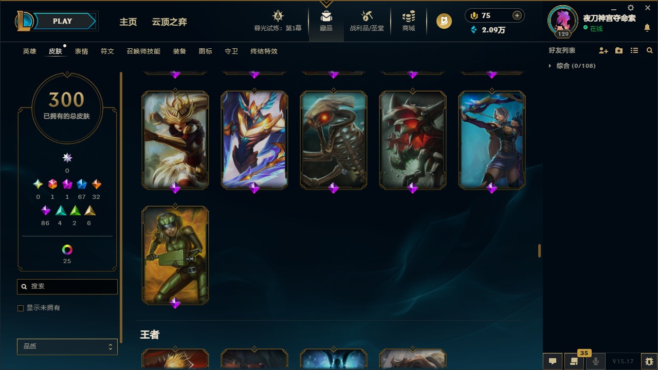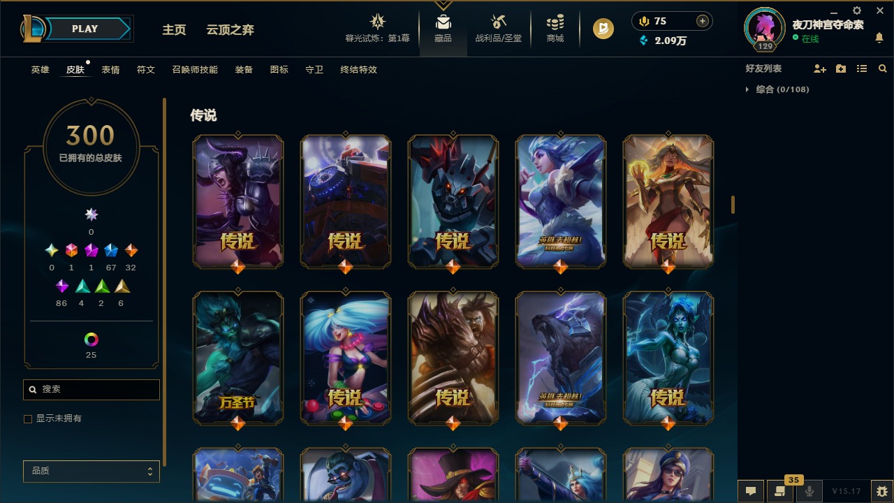 [11684318]1终极 1神话 67限定 32传说 86史诗 300皮肤 35炫彩 115英雄 可二次 可修改实名 优质装备:穿星魔锋,斩星魔剑,源代码 乐芙兰,防爆天使 凯尔,巧克力工坊 波比,电玩战魂 人马,防爆士兵 炼金,防爆士兵 格雷福斯,钢铁之翼 凤凰,冠军之血 希瓦娜,惊悚派对 阿木木,惊悚派对 费德提克,警用试作体K-9 内瑟斯,密林猎手 提莫,野兽猎人 德莱文,野兽猎人 瑟庄妮,野兽猎人 泰达米尔,御魔星矢 寒冰,灵魂守卫,霸天巨兽·雪崩 墨菲特,玉剑传说 无影 竞星,玉剑传说 无影 莫问,净雪之月 莫甘娜 冬虹,魔女 阿卡丽 虚荣 限定:战熊骑士,创星之灵 璐璐 情人节限定:甜心之翎 洛,甜心宝贝 娑娜 冠军限定系列:S1FNC 酒桶,S2 暗杀星 蒙多,S3 SKT T1 劫,S4 SSW 图奇,S4 SSW 炼金,S5 SKT T1 雷克顿,S5 SKT T1 阿利斯塔,S5 SKT T1 阿兹尔,S5 SKT T1 蜘蛛,S6 SKT T1 烬,S7 SSG 嘉文四世,S7 SSG 洛,S7 SSG 纳尔,S7 SSG 塔利亚,S7 SSG 霞,S7 SSG 伊泽瑞尔 冰雪节限定:“主人不要我了” 阿木木,冰雪节 马尔扎哈,冰雪节 炼金,胡桃夹子 小丑,平安夜女神 娑娜,魄罗骑士 瑟庄妮,圣诞开心鬼 提莫,圣诞精灵 崔丝塔娜,圣诞狂欢 时光,圣诞老人 酒桶,圣诞玩偶 波比,圣诞驯鹿 克格莫,冰雪节 茂凯,邪恶圣诞老人 维迦,幸福女神 乐芙兰,雪球也能爆炸 吉格斯,雪装 奈德丽 泳池派对:泳池派对 吉格斯,泳池派对 菲奥娜 万圣节限定:鬼影森森 茂凯,鬼影重重 魔腾,魅惑女巫 莫甘娜,南瓜头 费德提克,无头骑士 人马 年限:猴年 凯特琳,鸡年 盖伦 周年:2周年 德莱厄斯,3周年 厄运小姐,4周年 锐雯,5周年 阿狸,7周年 泰隆